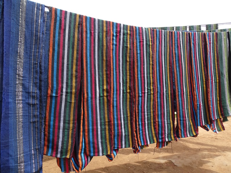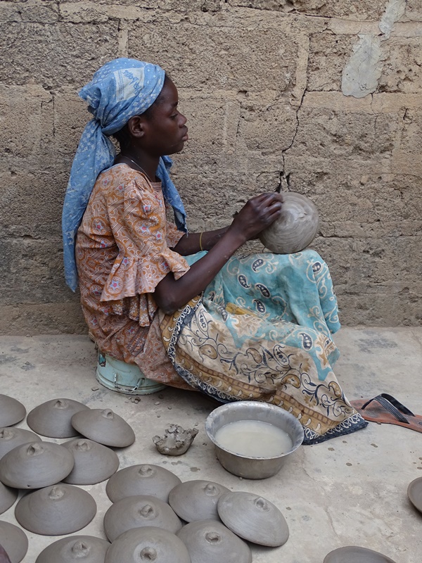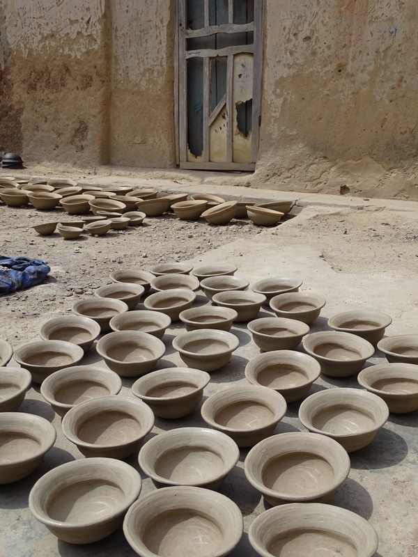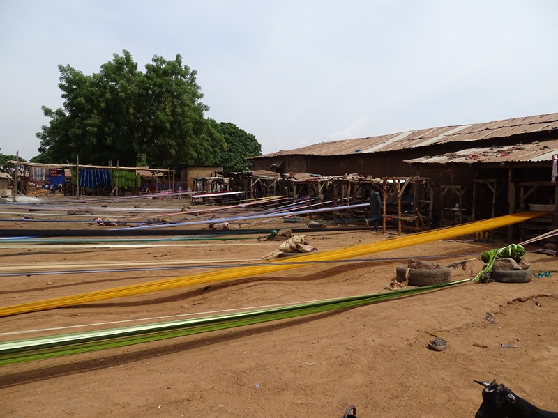Der erste Ort, den ich besucht habe, war eine Art Atelier, allerdings im Freien. Dort sind die Weber tätig und zwar schon seit über 200 Jahren. Die Webkunst von Ilorin hat also eine lange Tradition und ist ein männliches Betätigungsfeld. Sowohl an den Webstühlen wie auch an den Spindeln und Spulen sitzen nur Männer. Die Frauen hingegen gehen dem Töpferhandwerk nach. Gleich nebenan. So kann man hier zwei alte traditionelle Handwerke auf einmal bestaunen.
