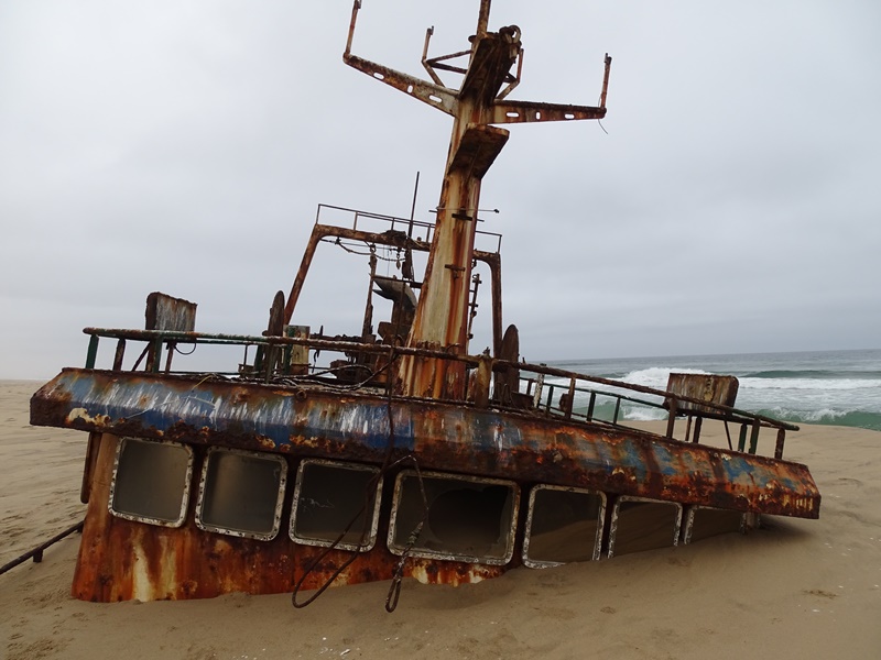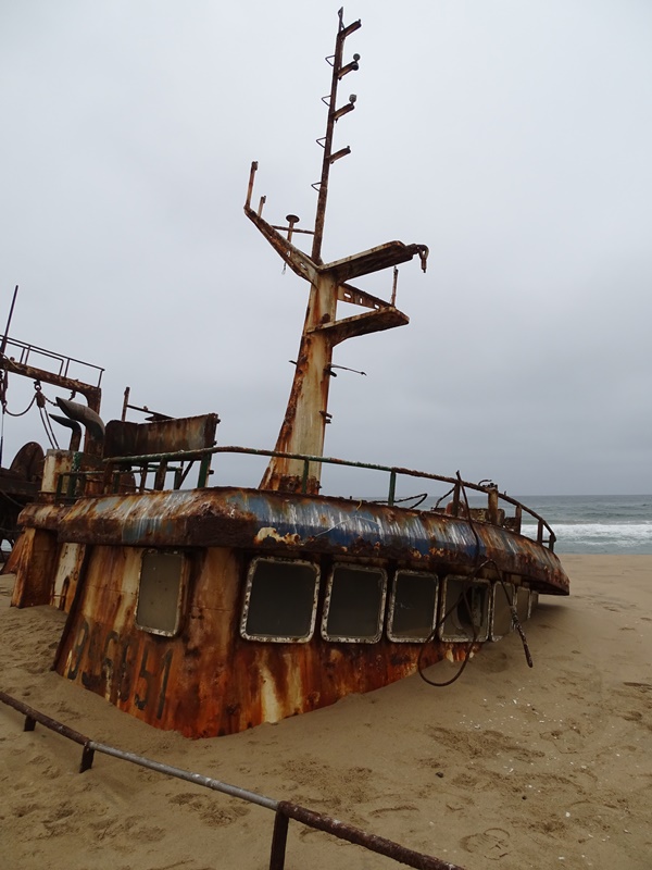 Hier bei Tombwa heißt dieser Sand Nationalpark do Iona. Ich hatte ein bisschen Pech mit dem Wetter, denn es war den ganzen Tag über wolkig und diesig. Dennoch waren die Sanddünen im Nationalpark eindrucksvoll. Bei Sonnenschein wären sie sicherlich noch einen Hauch rötlicher gewesen. Und sicher auch fotogener. Wir auch immer. Sand fasziniert mich, vor allem, wenn er in solchen Mengen auftritt und ich ihn mit niemandem teilen muss. Kein Tourist weit und breit. Auch nicht am Wüstenschiff Vanessa, das einer der Foto-Spots in der Region ist. Das Wrack eines indischen Fischerbootes, das aus ungeklärten Gründen Vanessa getauft wurde. Sehr cool.