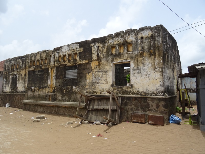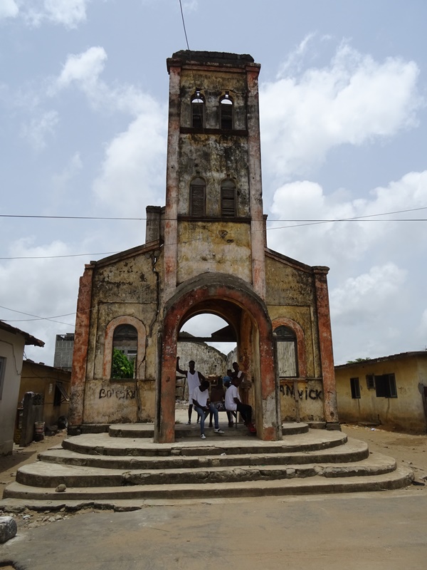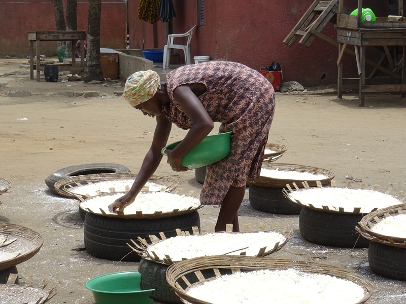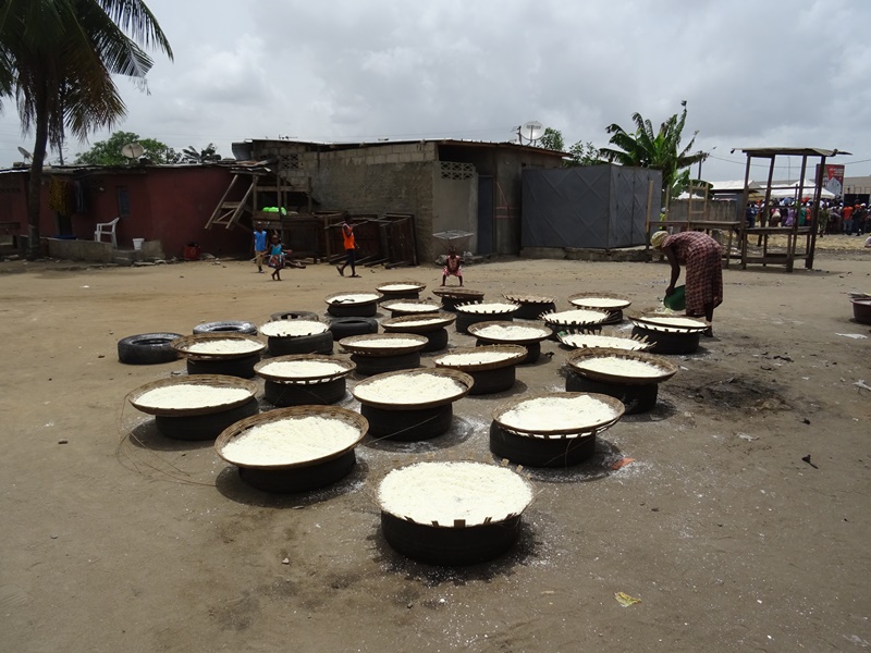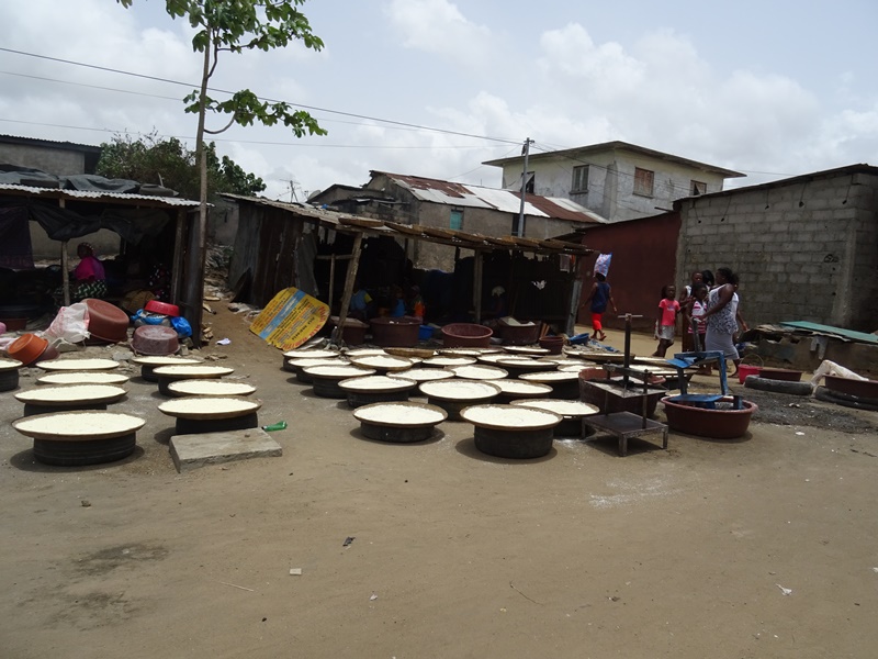 In Abobodoumé, das zwischen Youpougon und Plateau liegt, kann man in den Hinterhöfen den Damen dabei zusehen, wie sie Maniok in Wasser einlegen, ihn zermahlen oder zerkleinern und dann daraus Attiéké herstellen. Auf breiten flachen Körben trocknet die Masse, bevor sie dann wie Reis zubereitet werden kann. Ein paar Blocks weiter steht noch eine Kirche aus der französischen Kolonialzeit, deren Dach irgendwann abhanden kam und die nun als hübsche Ruine an vergangene Zeiten erinnert. Hier in der Hauptstraße von Abobodoumé, wo nur alle paar Minuten mal ein Wagen vorbei kommt, kann man kaum glauben, dass man sich in einer Millionenstadt befindet.