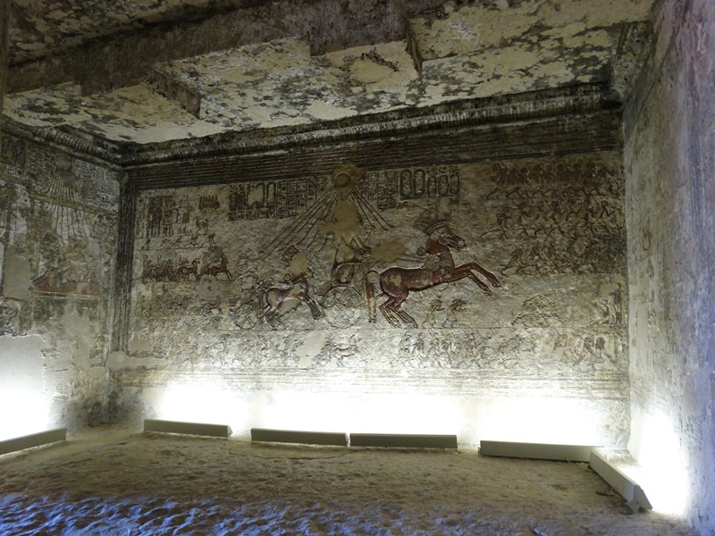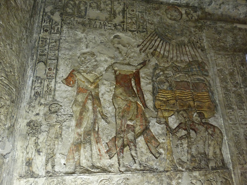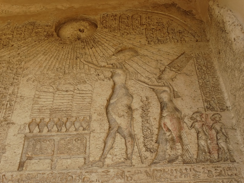 Das Grab Nummer fünf hat dem Hohen Priester Penthu gehört. Hier ist leider schon fast alles zerstört. Aber Grab Nummer vier ist der Hammer. Hier ist Menyra geerdigt gewesen, einer der Hohepriester des Aton und im Inneren ist in einer der Kammern noch fast alles an Reliefs und Zeichnungen erhalten. Und zwar in einer Qualität, die kaum zu glauben ist, denn diese Malereien sind ja nun schon 3400 Jahre alt. Echnaton reitet auf einem Streitwagen, auch wenn er nie in einem Krieg gezogen ist. Die Sonne, das Symbol für den Sonnengott Aton, strahlt auf ihn herab und ihre Strahlen enden in kleine Händen, die nach dem Pharao greifen. Menschen mit Opfergaben kommen zu seiner Beerdigung und es sind mehrere Szenen dargestellt, in denen die Familie von Echnaton zu sehen ist: seine der Legende nach wunderschöne Frau Nofretete und seine Kinder, die wahrscheinlich weniger wunderschön waren, denn Echnaton und Nofretete waren Geschwister, wie auch wahrscheinlich ihre Eltern schon.