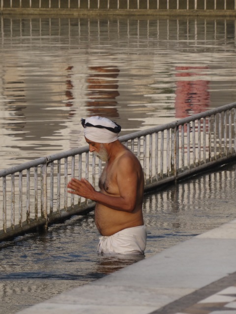 Amritsar war auf meiner vergangenen Indienreise ein absoluter Höhepunkt. Ich wusste nicht viel über die Stadt, außer, dass sie die Hauptstadt der Sikh ist. Das sind die Leute mit den kunstvoll gewickelten Turbanen, deren Gott ihnen verbietet, die Haare zu schneiden. Allein schon wegen dieser Tatsache erschien mir eine Reise nach Amritsar interessant. Die Sikh haben ihrem Gott, der offenbar total auf lange Haare steht, die dann aber letztendlich doch niemand bewundern darf, weil sie immer unter dicken bunten Turbanen verborgen sind, hier in Amritsar einen wahnsinnig goldenen Tempel gebaut.