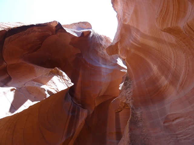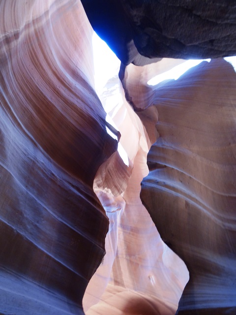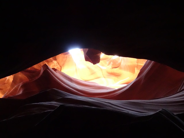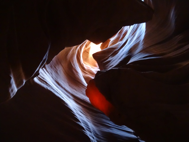 Der Antelope Canyon entschädigt dann für alle Unannehmlichkeiten – man vergisst fast, dass man gerade 48 Dollar gezahlt hat – und ist einfach überwältigend schön mit seinen bizarren, harmonischen und gleichzeitig willkürlichen Felsformationen, in denen das Licht nur hier und da mal bis zum Boden gelangt. Hier kann fast jeder Hobbyfotograf mit egal welcher Kamera traumhafte Bilder machen, denn das Motiv, das man von Naturkalendern kennt, ist einfach sehr fotogen. Der indianische Führer kennt die besten Fotopunkte und zeigt den Besuchern, wo sie in den Felsen sowie in dem Spiel aus Licht und Schatten einen weißen Hai, ein Auge, einen Braunbären und sogar Abraham Lincoln erkennen können.