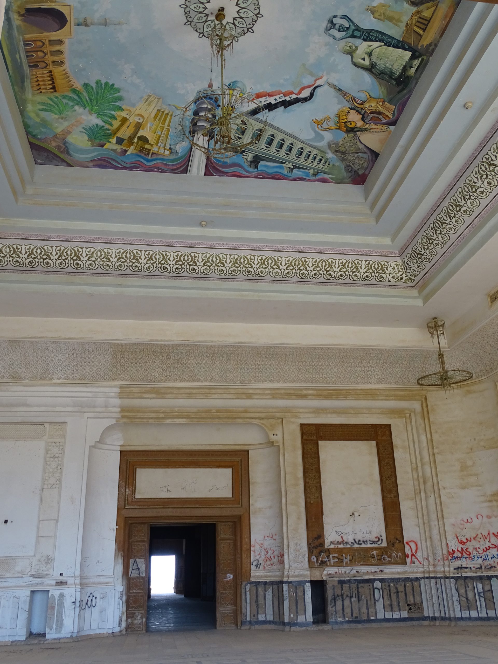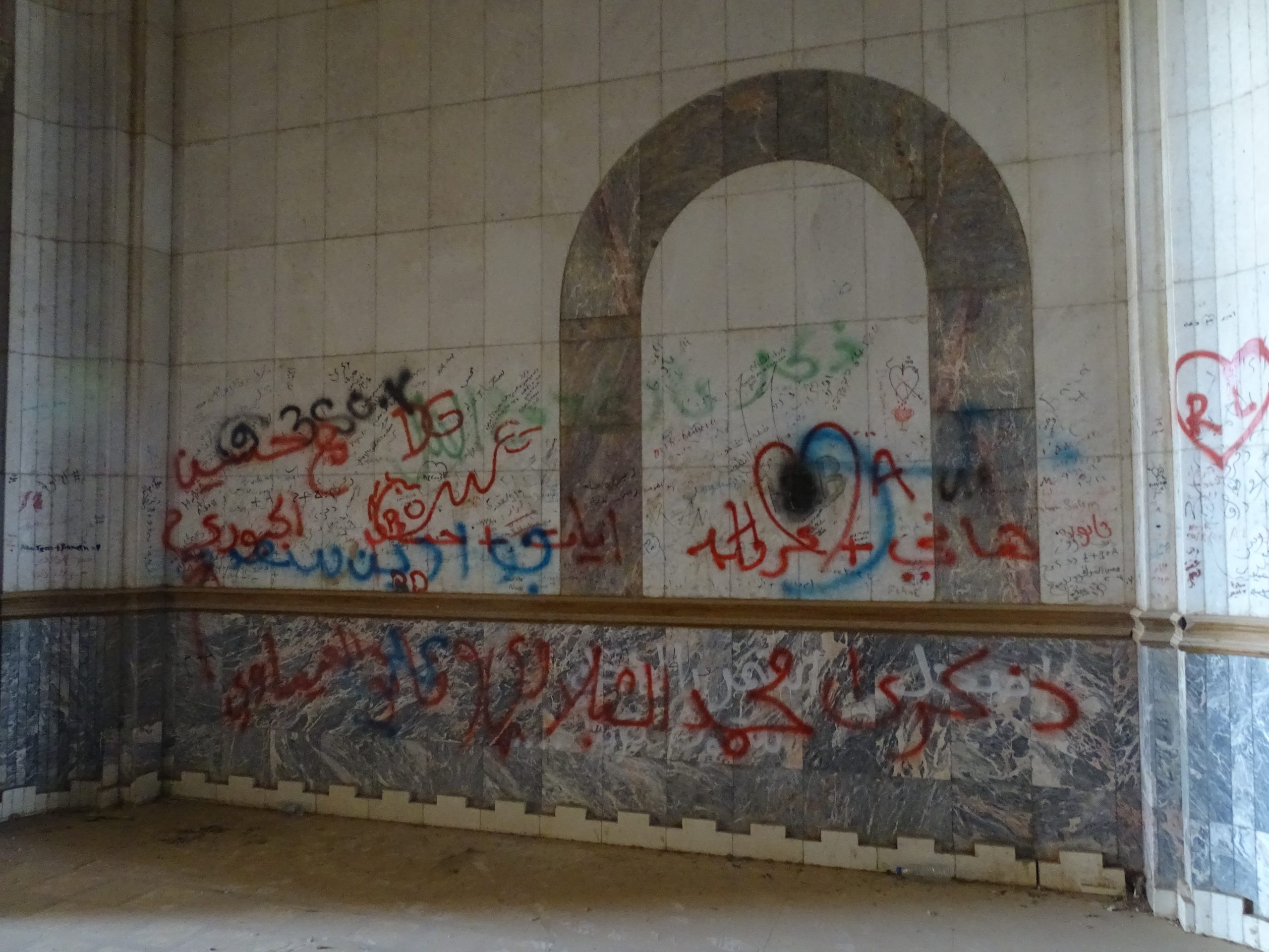 Eine weitere spannende Sehenswürdigkeit, wenn man es so nennen kann, ist der Palast, den sich Saddam gebaut hat. Er thront auf einer Anhöhe über Babylon mit dem perfekten Ausblick auf die antike Stadt und den Euphrat. Wenn man Beziehungen hat und die hier stationierten Polizisten besticht, darf man sich den Palast ansehen. Er hat keine Fenster mehr, viele Fliesen fehlen, alle Wände sind mit Graffiti besprüht. Aber man kann erahnen, wie prachtvoll das Gebäude einst war. Und nicht jeder Weltreisende kann von sich sagen, schon einmal in Saddam Husseins Badezimmer gewesen zu sein.