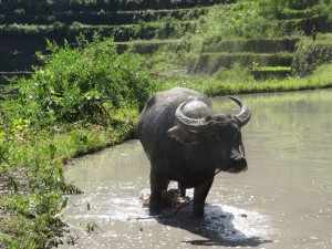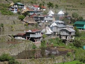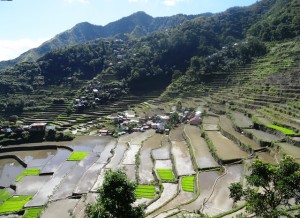 Das Dorf Banaue liegt zwischen grünen Hügeln und sein Klima ist – zumindest jetzt im Dezember – sehr angenehm. Die Taifunsaison ist vorüber und ich kann mich über sonnige 28 Grad freuen. Um Banaue herum wird an allen möglichen und vor allem an den unmöglichen Stellen Reis angebaut. Die Menschen haben hier schon vor 2000 Jahren Terrassen angelegt, auf denen man mit sehr viel Mühe und Geduld etwas anbauen kann.
