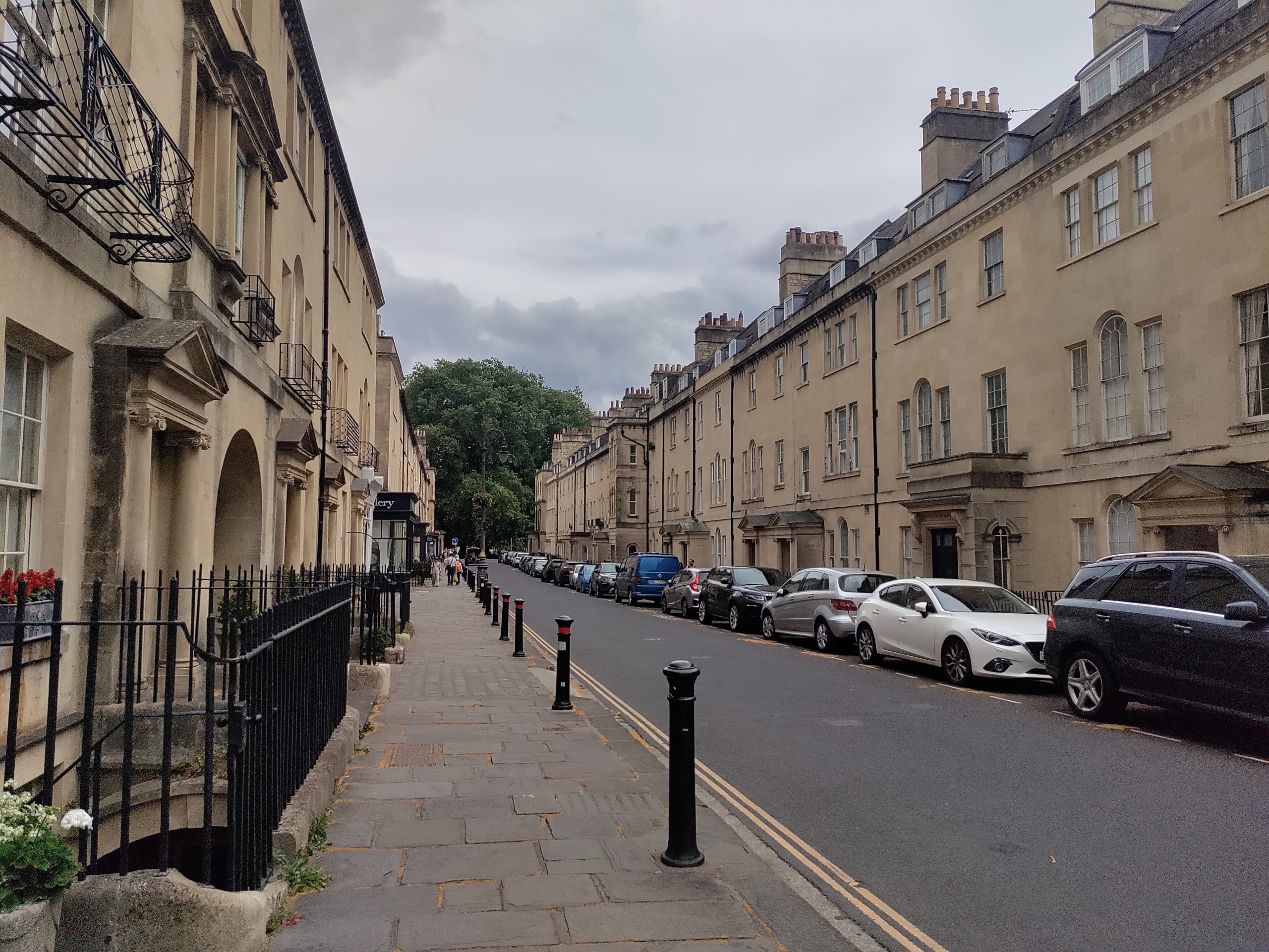 Die Häuser leuchten in hellem, goldgelbem Stein. Fast alles ist aus dem berühmten Bath Stone gebaut. Die meisten Gebäude stammen aus dem 18. Jahrhundert. Damals war Bath ein Treffpunkt für Reiche und Künstler. Die Stadt ist bekannt für ihre georgianische Architektur. Der Royal Crescent fällt sofort auf: eine riesige, gebogene Häuserreihe mit 30 eleganten Stadthäusern, gebaut zwischen 1767 und 1774. Gleich daneben liegt The Circus, ein kreisrunder Platz mit drei geschwungenen Häuserzeilen – inspiriert vom Kolosseum in Rom. Ein Steinkreis der modernen Art. Alles wirkt sehr einheitlich und edel. Aber in den Hinterhöfen und in einigen Gassen spitzen auch Graffiti und kleine Künstlerläden hervor, die das strenge Stadtbild auflockern.