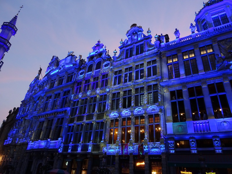 Schrägerweise war auf der Grand Place gleichzeitig ein ganz anderes Spektakel im Gange. Dort fand der Ommegang statt. Das ist ein Umzug mit mehr als 1000 Leuten in historischen Kostümen, mit Pferden, Wagen und riesigen Pappmascheedrachen. Die Gebäude an der Grand Place waren wunderschön angestrahlt, wie sonst im Winter und es habe Nebel und Opernsänger. Der Kontrast zwischen Ommegang und Fußballparty hätte nicht größer sein können.