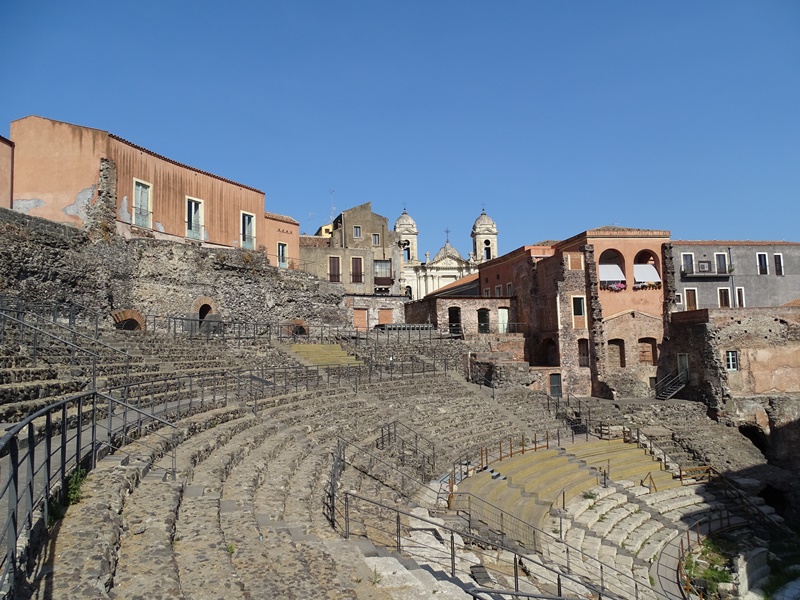 Catania selbst ist vielleicht keine Stadt, in der man mehrere Tage verbringen will, denn es gibt kaum grün in dem dichten Gewirr von historischen Gebäuden. Der Asphalt hat sich ordentlich aufgeheizt Ende August und die Luftqualität scheint verbesserungswürdig. Aber es gibt dennoch einiges zu sehen. Der Platz mit der Kathedrale Sankt Agathe ist hübsch und dank Corona fast menschenleer. Ebenso verhält es sich mit dem römischen Theater, wo wir die Szenerie fast für uns haben.