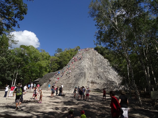 Ich erfahre, dass es ab 2017 endlich verboten sein wird, auf die Pyramide hinauf zu steigen. In den letzten Jahrzehnten haben Millionen von Touristenfüßen nicht eben dazu beigetragen, die Ruine in ihrem Zustand zu erhalten. Bald wird also die Nohoch Mul Pyramide gesperrt und darf sich dann ein wenig erholen. Ich darf jedoch noch hinauf steigen und dabei sehr interessante Auf- und Abstiegstechniken anderer Touristen beobachten.