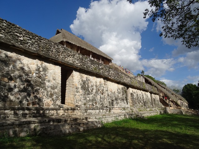 Das Schöne an Ek Balam ist, dass man hier nicht Schlange stehen muss. Die Ruinenstätte wurde erst vor wenigen Jahren für Besucher freigegeben und war damit ein für mich noch unbekanntes Ziel. Auf dem Gelände von Ek Balam gibt es einige kleinere Pyramiden, einen Ballspielplatz und zum krönenden Abschluss ein ziemlich riesiges Bauwerk. Es ist nicht eigentlich eine Pyramide, aber in der Mitte kann man auf den Stufen 32 Meter hinauf steigen und auf den rings herum gelegenen flachen Dschungel schauen.