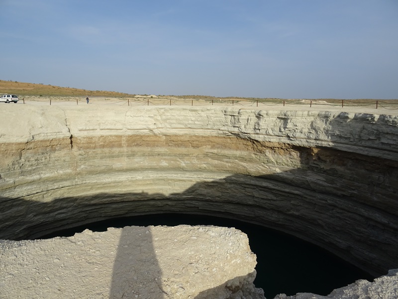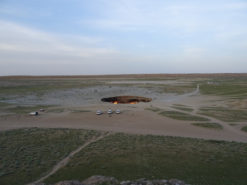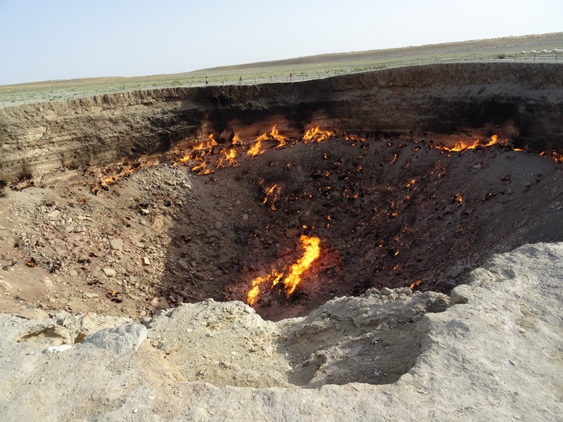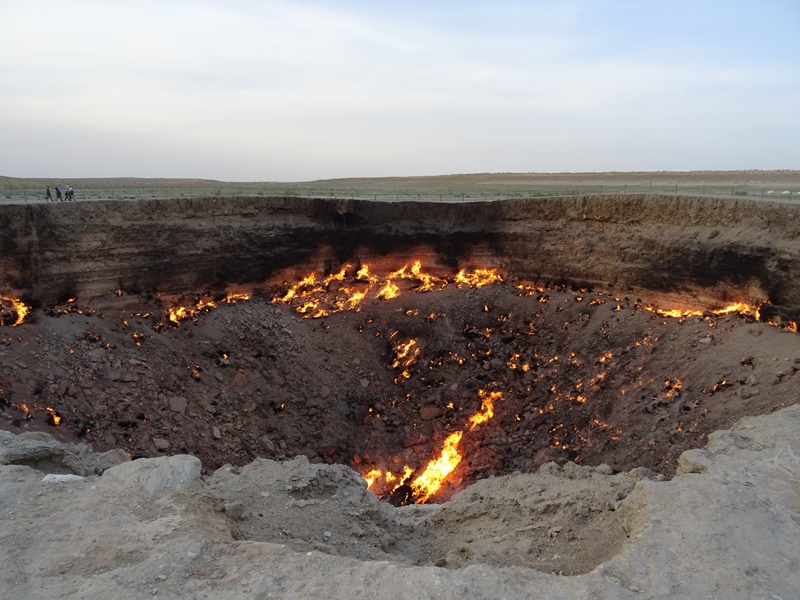 Darwaza ist ein Loch im Boden. Aber nicht irgendein Loch. Hier ging vor vielen Jahren eine Probebohrung nach Gas etwas schief und es entstand ein Krater von etwa 70 Metern Durchmesser. Man weiß bis heute nicht genau, wie das Gas sich entflammte. Vermutlich waren es die Bewohner der Umgebung, die es leid waren, dass ihre Ziegen in den Krater fielen oder sich Gasvergiftungen in der Nähe holten, die etwas Brennendes hinein warfen.