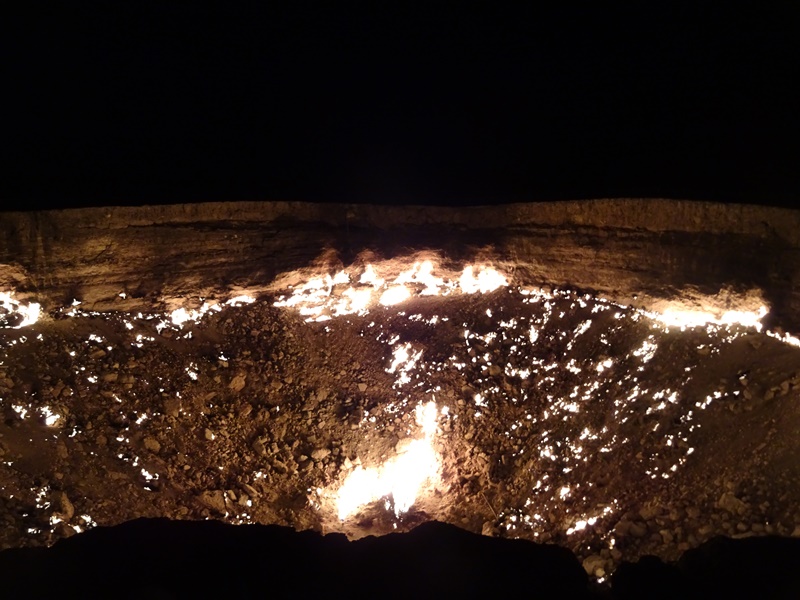 Seither brennt auf jeden Fall dieser Krater. Tag und Nacht. Das aus Sitzen und Öffnungen entweichende Gas brennt lichterloh. Am Boden in der Mitte gibt es eine fünf Meter hohe Stichflamme und rundherum brennen zahlreiche kleinere Flammen. Seit fast 50 Jahren brennt der Krater, den man liebevoll als das Tor zur Hölle bezeichnet.