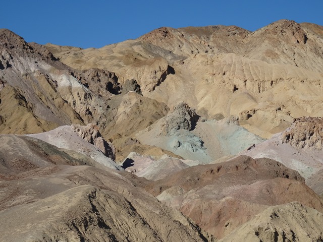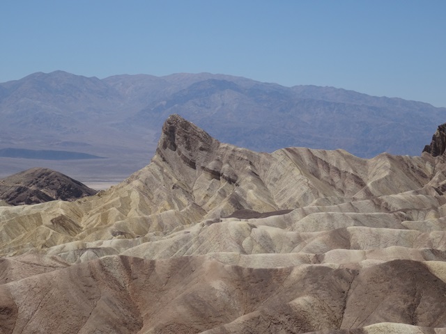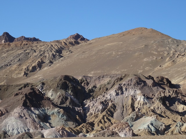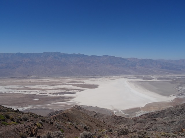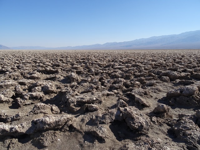 Als ich von oben ins 1700 Meter unter mir gelegene Tal hinab blicke, sehe ich ausgedehnte weiß in der Sonne schimmernde Flächen, die mir anzeigen, dass sich dort unten Salz befindet. Als ich dann später unten im Tal auf der weißen Fläche stehe, sieht sie plötzlich aus wie ein riesiger brauner grob umgegrabener Acker. Erst als ich mich hinknie, erkenne ich die Salzkrusten auf den braunen Steinen und ich erahne nun, warum diese Gegend als Death Valley bezeichnet wird. Zwar hat das Tal seinen Namen wohl von einer Reisegruppe erhalten, die im 19. Jahrhundert keinen Ausweg daraus fand, aber trotzdem ohne tatsächliche Verluste aus dem Tal des Todes entkam. Aber man kann sich kaum einen Ort auf der Welt vorstellen, der noch toter wirkt als dieses Death Valley.