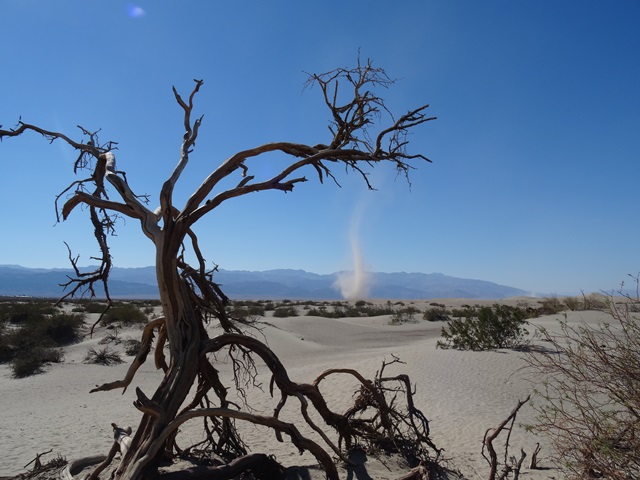 Die Landschaften sind grandios und trotz der schieren Hitze und Trockenheit sehr abwechslungsreich. Es gibt eine richtige kleine Sandwüste mit Dünen, auf der sich sogar eine höchst fotogene Windhose hin und her bewegt, als sei sie von einem Regisseur hier platziert worden. Einige Kilometer weiter befinden sich weite Salzbecken in einem Tal, dessen Tiefpunkt sich auf 89 Metern unter dem Meeresspiegel. Dort wo ich aus dem Auto aussteige bin ich auf minus 35 Metern, was mir ein Schild mitteilt.