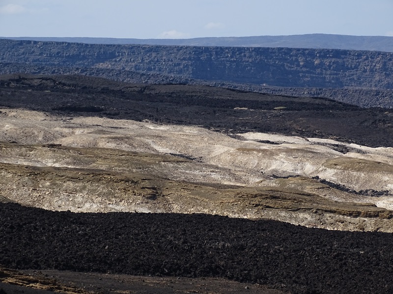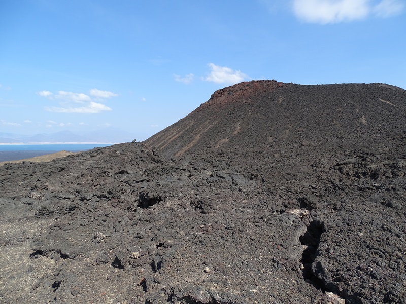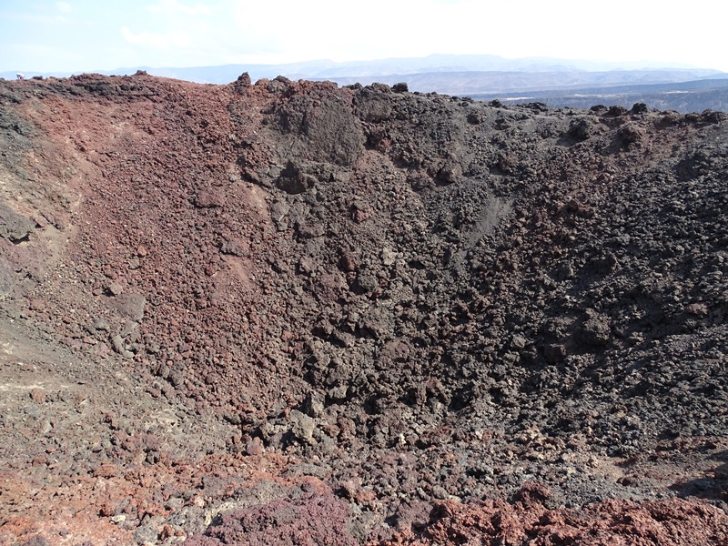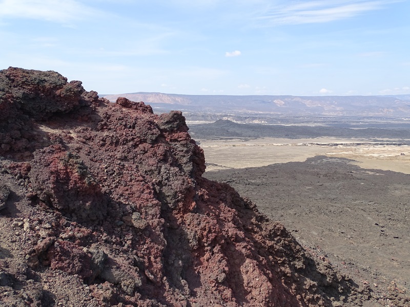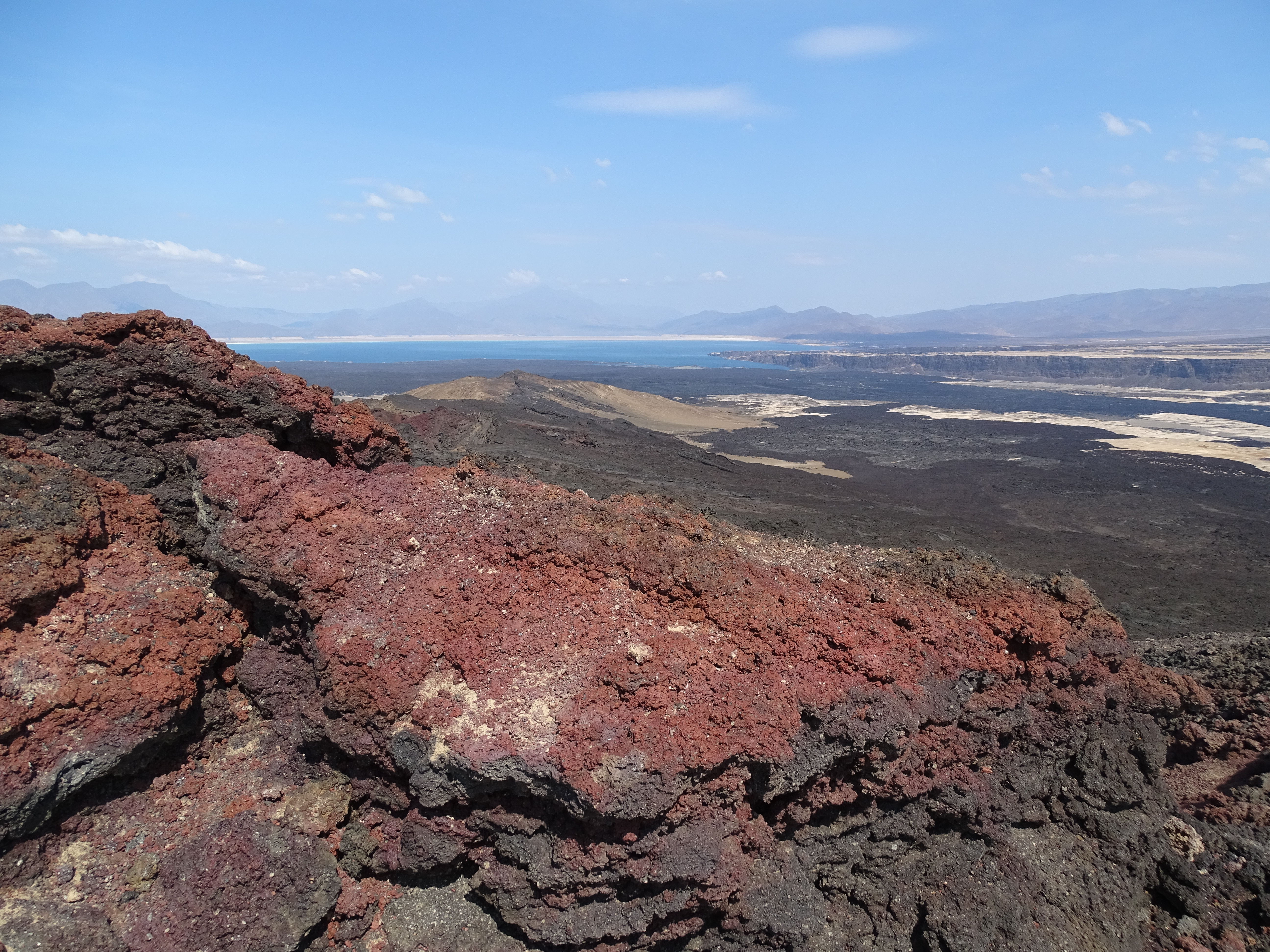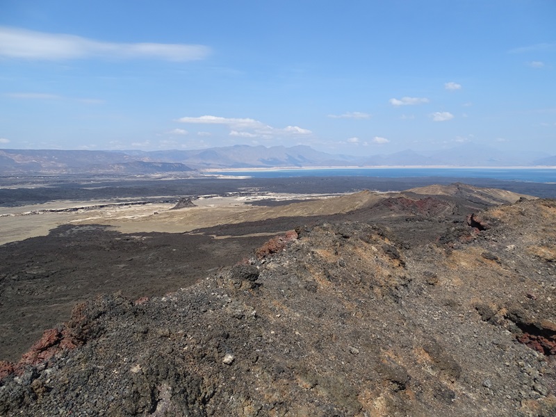 Wie auch immer. Der Ardoukoba ist ein Vulkan, den man schnell besteigen kann. Er hat die typische Form eines Vulkans und der Kegelstumpf ist schön zu erkennen. Die Lava sieht von Weitem schwarz aus. Bei näherem Hinsehen sind jedoch alle möglichen Braun- und Rottöne zu erkennen. Oben am Kraterrand sogar grünliche und gelbe Partien. Der Ausblick von oben ist eindrucksvoll, denn zur einen Seite erstreckt sich der tiefblaue Golf von Tadjoura und zur anderen deutlich weiter unten der gleißend weiß schimmernde Assalsee.
