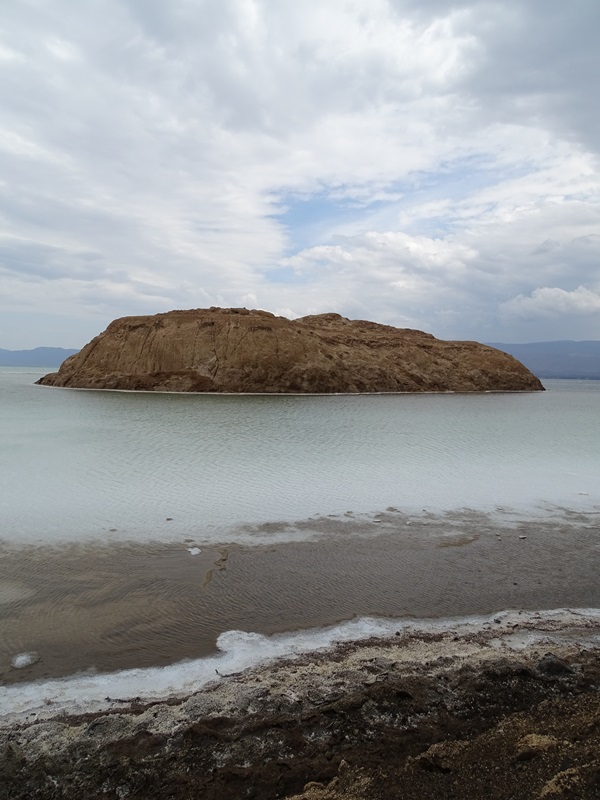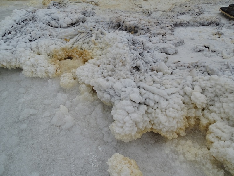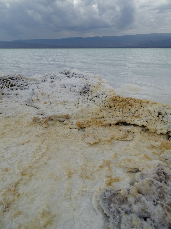 Die Landschaft am Assalsee ist faszinierend. Kann man das eigentlich Landschaft nennen, wenn es sich fast ausschließlich um Salz handelt? Rund um den See herum gibt es ein paar Berge. Aber die gesamte Ebene besteht aus Salz. Alles ist weiß, manchmal etwas gelblich, wenn sich ein wenig Schwefel hinein mischt, manchmal etwas schmutzig. Das Wasser des Sees hat über 35% Salzgehalt. Das ist sogar mehr als im Toten Meer.