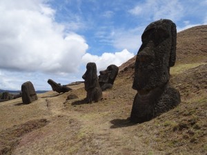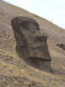 Im Steinbruch, wo die Moais aus dem Fels geschlagen wurden, kann man zahlreiche Figuren sehen, die beim Transport schon nach wenigen Metern umgekippt sind. Dann waren sie nutzlos, denn niemand wollte einen umgekippten Moai haben. Die Steinmetze mussten dann wieder von neuem Anfangen. Was tut man nicht alles für die Auftraggeber und letztendlich für die Götter?