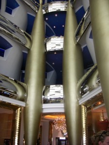 Ich besuche das Luxushotel Burj Al Arab und erfreue mich vor allem am Nachspeisenbuffet im Restaurant auf der obersten Etage. Von hier aus hat man einen tollen Blick auf die verschiedenen Inseln, die gerade im Meer gebaut werden (ja, hier werden sogar Inseln gebaut!) und man sieht den Helikopterlandeplatz des Hotels. Auf den Muffins sind kleine Goldplättchen, die man mitessen kann und ich ärgere mich sehr darüber, nicht über mehrere Mägen zu verfügen.
