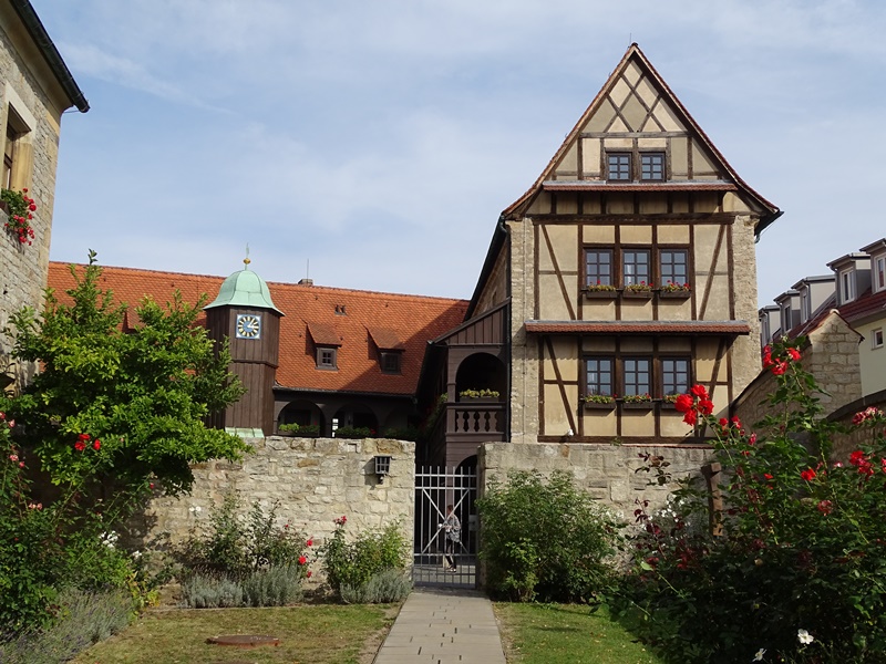 Anschließend habe ich mir noch den erst kürzlich entdeckten Schatz von Erfurt angesehen. Den hatte man 1998 erst gefunden, bei Bauarbeiten. Es handelt sich um einen richtigen Schatz aus Gold, Silber, Schmuck und so weiter. Er gehörte allerdings nicht einem Piraten sondern einem jüdischen Bürger von Erfurt, der ihn in weiser Voraussicht begraben hat. 1349 wurden nämlich alle Juden in Erfurt in einem von der Stadtregierung geplanten und angeheizten Pogrom umgebracht. Glücklicherweise fanden die Mörder den Schatz nicht und so konnte er bewahrt werden und ist heute in der Synagoge ausgestellt, die ebenfalls durch viele Zufälle bewahrt werden konnte, hauptsächlich deshalb, weil sie zu zugebaut worden war, dass niemand mehr wusste, dass es sie überhaupt gab. Riesig war das Erstaunen, als man in einem Gewirr von alten Mauern plötzlich eine vollständige Synagoge fand. Jetzt hat Erfurt seit einigen Jahren auch noch die wahrscheinlich älteste vollständig erhaltenen Synagoge in Europa.