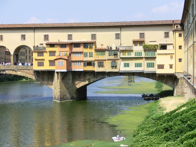 Und dann erst im Innern: Da ist jeder Quadratzentimeter mit Kunst zugepflastert, selbst Boden und Decke sind Kunstwerke, so dass man kaum weiß, wo man hin schauen soll. Diese Überfülle an Gemälden, Statuen, Gold und edlen Steinen überfordert mein Auge, wie auch meinen Fotoapparat. Die alte Brücke Ponte Vecchio hingegen lässt sich prima fotografieren, zumindest von weitem. Als ich dann hingegen auf der besagten Brücke stehe, ist es nicht mehr möglich, ein Foto zu machen, ohne nicht mindestens 44 Touristen auf dem Bild zu haben.