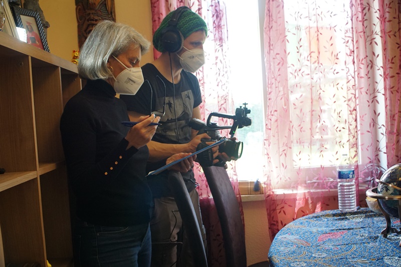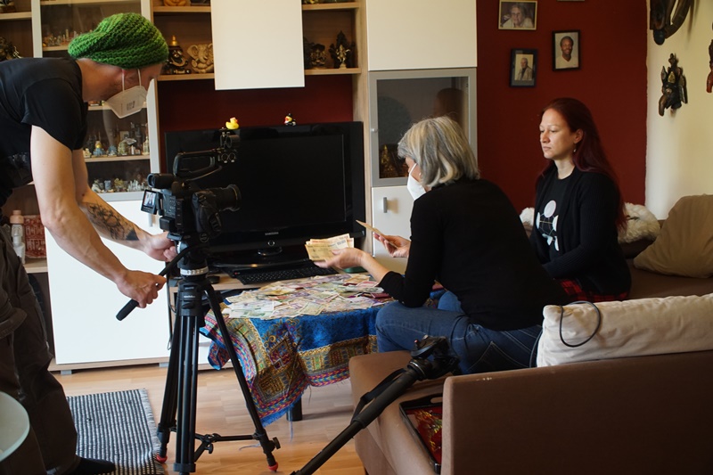 Am Samstag war es so weit. Ich hatte unsere Wohnung geputzt und sogar die Elefanten abgestaubt. Ich war ein bisschen aufgeregt. Mit Maske, Kamera und Klemmbrett standen die beiden schließlich vor der Haustür. Ich war beeindruckt davon, wie der fünfminütige Beitrag dann langsam Gestalt annahm, beinahe wie nach einem kleinen Drehbuch.