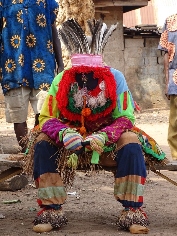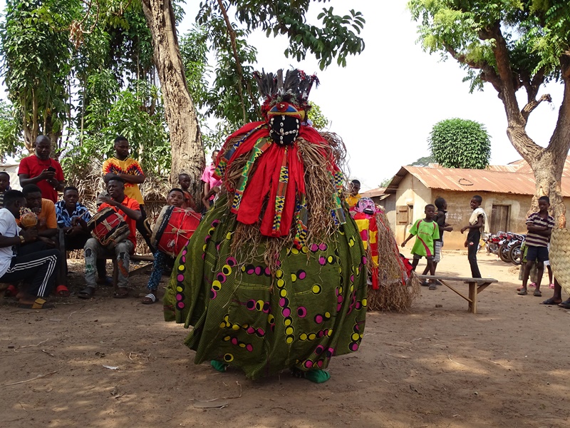 Spannend war auch der Maskentanz, der mit herrlichen Bastkostümen und imposanten Masken aufgeführt wird, zu Feiertagen, zur Ernte, bei wichtigen Zeremonien, aber eben auch um Gäste willkommen zu heißen. Der Tanz ist ein Event, das es nicht alle Tage gibt. Das merke ich daran, dass das gesamte Viertel auf den Beinen ist. Alle schauen zu und lassen sich vom Rhythmus mitreißen.