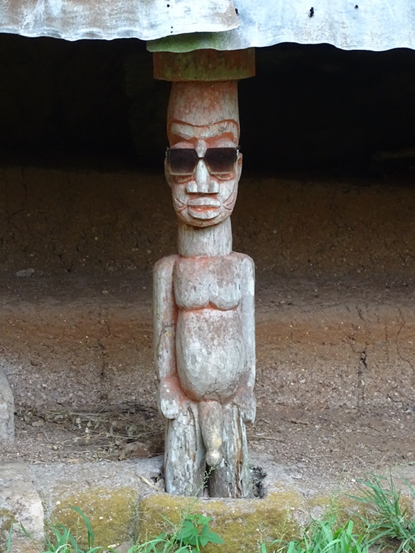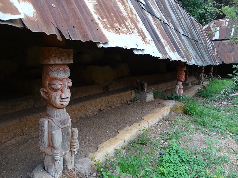 Der Besuch in dem alten Königspalast ist nur mit einigem Klettergeschick möglich, aber er lohnt sich, auch wenn er schweißtreibend ist. Ich bin begeistert von dem alten Bauwerk aus Lehm, dessen Dach von geschnitzten Figuren gehalten wird. Hier lauern viele spannende Geschichten rund um das Königshaus und die Geschichte der Idanre.