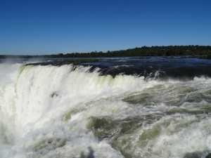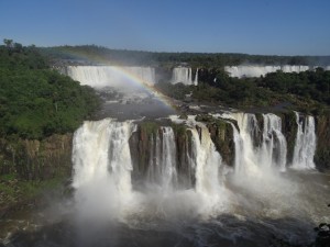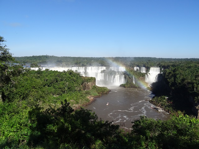 Auf der brasilianischen Seite sieht man die ganze Pracht dann aus einem anderen Blickwinkel. Wieder mache ich dutzende Fotos aus allen möglichen Positionen heraus und hier werde ich dabei auch noch richtig nass. Die Brasilianer haben nämlich einen Steg gebaut, der bis zu einer exponierten Stelle hin reicht, wo quasi von allen Seiten Wasser hinab stürzt. Der Regenbogen ist eindrucksvoll, vor allem, wenn die Sonne so wunderschön scheint.