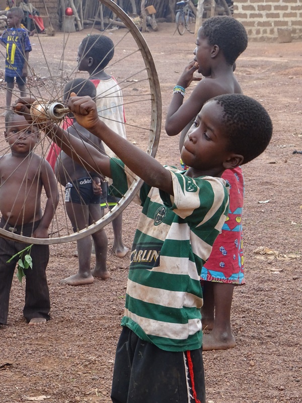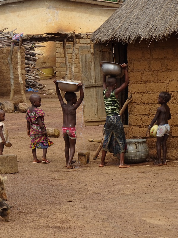 Ich beobachte Schweinchen, die nach etwas Essbarem suchen, Kinder, die Wasser vom Brunnen zu den verschiedenen Lehmbauten bringen und schließlich andere Kinder, die auf viel zu großen Fahrrädern fahren und das, obwohl sie nur eines der Pedale erreichen können.