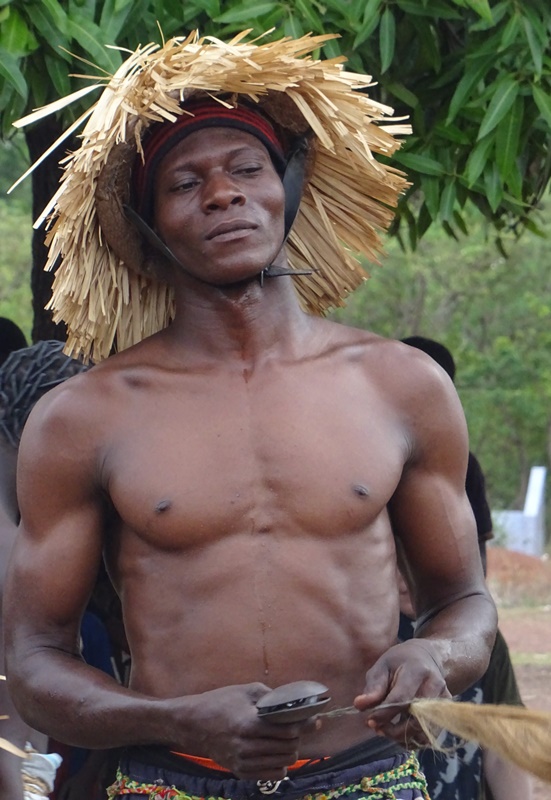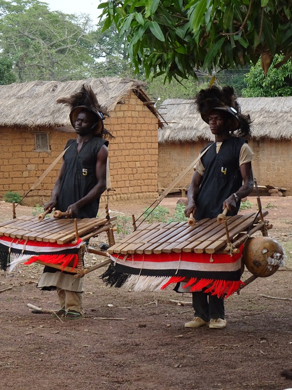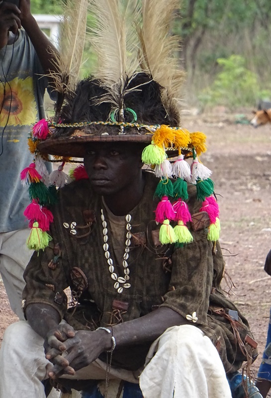 Schließlich trudeln gegen 17:30 dann doch noch ein paar Erwachsene ein. Der erste bringt ein etwa 50 cm hohes buntes Pferd aus Holz und stellt es auf dem Dorfplatz ab. Etwas später erscheinen dann endlich Männer mit Musikinstrumenten und die Tänzer. Als die ersten Klänge des Balafons zu vernehmen sind, füllt sich der Dorfplatz im Handumdrehen mit Menschen. Mindestens 50 Dorfbewohner, mehr als die Hälfte von ihnen Kinder, sind gekommen, um sich den Tanz anzusehen. Das Spektakel scheint also nicht allzu oft stattzufinden. Auf dem hölzernen Pferdchen sitzt ein Mann mit einem eindrucksvollen federgeschmückten Kopfschmuck, der für die Tänzer verantwortlich ist.
