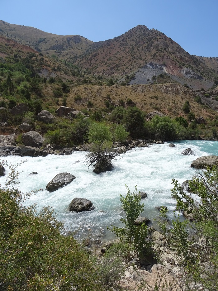 Der Iskanderkul ist zunächst einmal nur ein See, aber ein eindrucksvoll schöner, denn er liegt zwischen richtig hohen Bergen und schimmert hellblau in der Sonne. Ein Postkartenanblick. Es gibt einen kleinen Strand unten am See, der aus grauen Kieselsteinen besteht. Der Rest des Ufers ist eher steil und rau. Aus dem Iskanderkul fließt der Iskanderkulfluss ab und zwar in Form eines eindrucksvollen 38 Meter hohen Wasserfalls. Hier bildet sich ein schöner Regenbogen, wenn die Sonne scheint, was sie ständig tut – zumindest im Sommer. Die Landschaft sieht hier aus wie in Utah oder Nevada. Steinig und trocken.