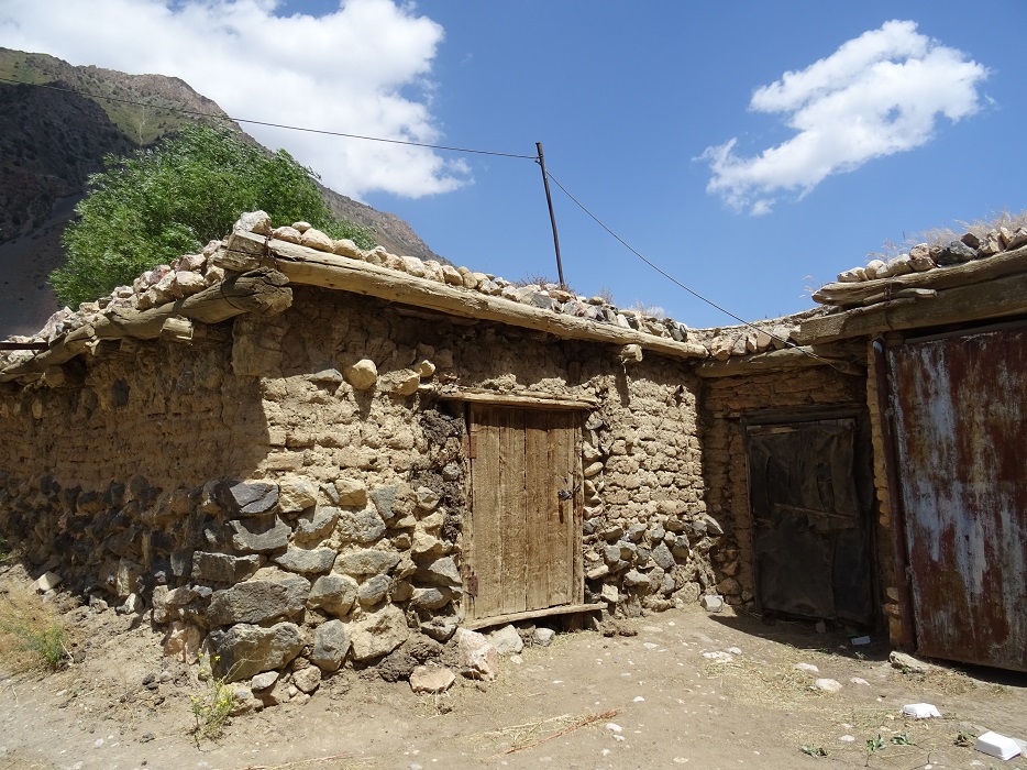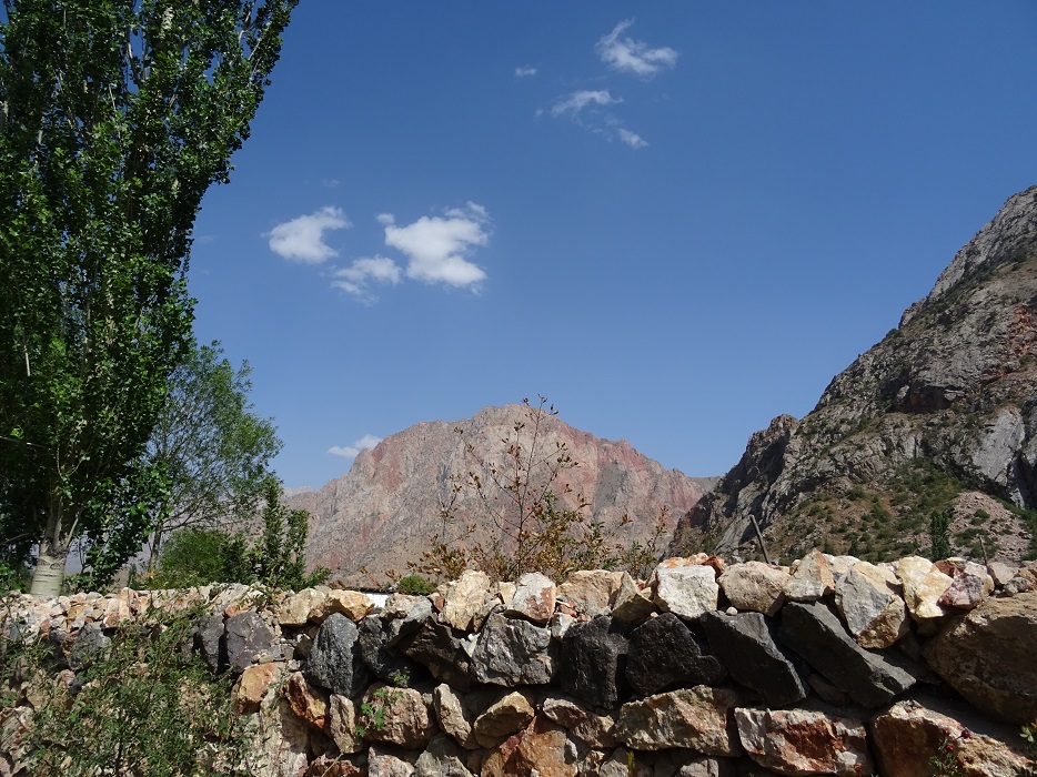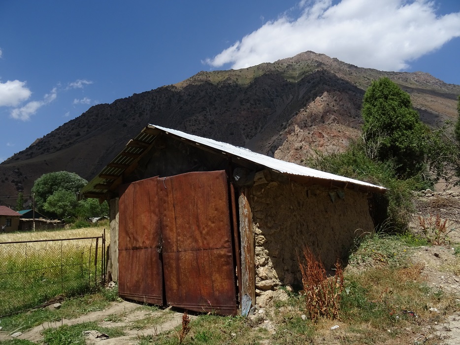 Fünf Kilometer vom Iskanderkul entfernt, liegt das verschlafene Dörfchen Saritag. Hier sind nur ein paar hundert Menschen zu Hause. Sie wohnen in Lehmhäusern, die mit Blechdächern versehen sind. Sie haben Gärten, Esel, Kühe und Obstwiesen, sind von malerischen Bergen umgeben und haben sogar eine Stromleitung, die ihnen Fernsehen und Radio erlaubt. Das haben sie auch bitter nötig, denn im Winter sind sie oft monatelang von der Außenwelt nahezu abgeschlossen, weil die Straßen und Pässe verschneit sind. In diesem Dörfchen habe ich in einem Gästehaus übernachtet. Duschen gab es nicht, die Toilette war ein Loch im Boden hinterm Haus. Aber es gab zu Essen und Tee und Matratzen mit dicken Decken und wie erwähnt sogar elektrisches Licht!