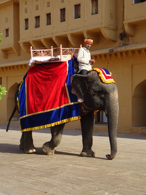 Schließlich bleiben natürlich noch die eindrucksvollen Festungsanlagen zu erwähnen, die auf einem der Hügel unmittelbar am Rand der Dreimillionenmetropole Jaipur liegen. Das Amber Fort ist zwar offiziell 12 Kilometer von Jaipur entfernt im Dorf Amber zu finden, aber je nachdem, wo man in Jaipur startet, dauert es nur wenige Minuten, um zum Amber Fort zu gelangen. Es ist mächtig und von einer dicken hohen Mauer umgeben. Elefanten bringen Touristen auf einem schmalen Weg den Berghang hinauf. Seit 2005 ein Elefant wirklich wütend wurde und sogar jemanden tötete (wahrscheinlich aus Versehen), dürfen die Elefanten nur noch dreimal pro Tag den Weg zum Fort antreten. Die Touristen dürfen die Elefanten auch nicht mehr knuddeln – sehr zu meinem Leidwesen, aber sicherlich sehr zum Wohl der gestressten Tiere.