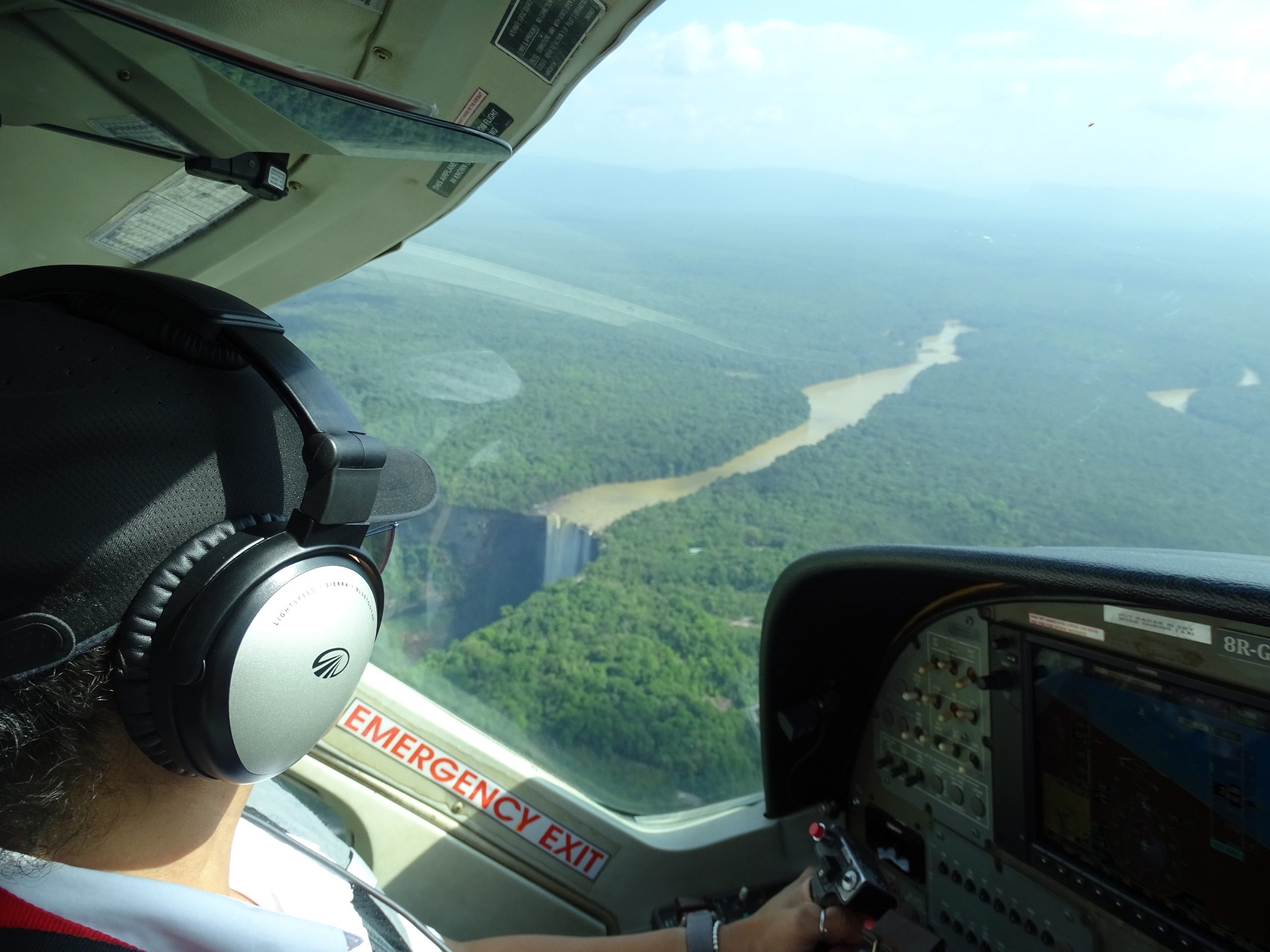 Vor der Landung dreht die Pilotin eine Schleife über dem Wasserfall, sodass alle auf allen Seiten einmal einen richtig guten Blick auf den Wasserfall werfen können. Dann landen wir auf einer winzigen Landebahn mitten im Dschungel auf dem Hochplateau, von dem der Kaieteur sich hinab stürzt.