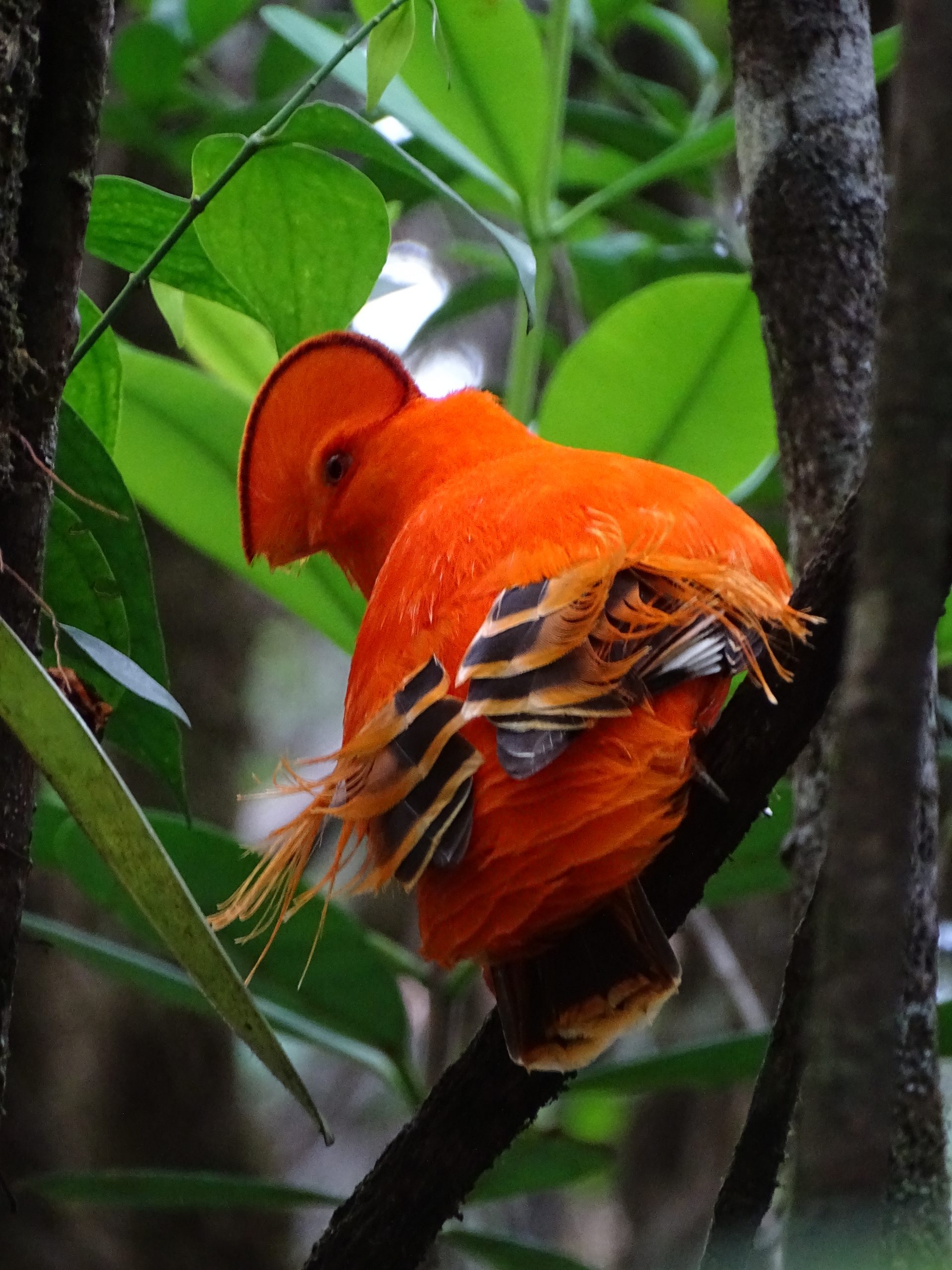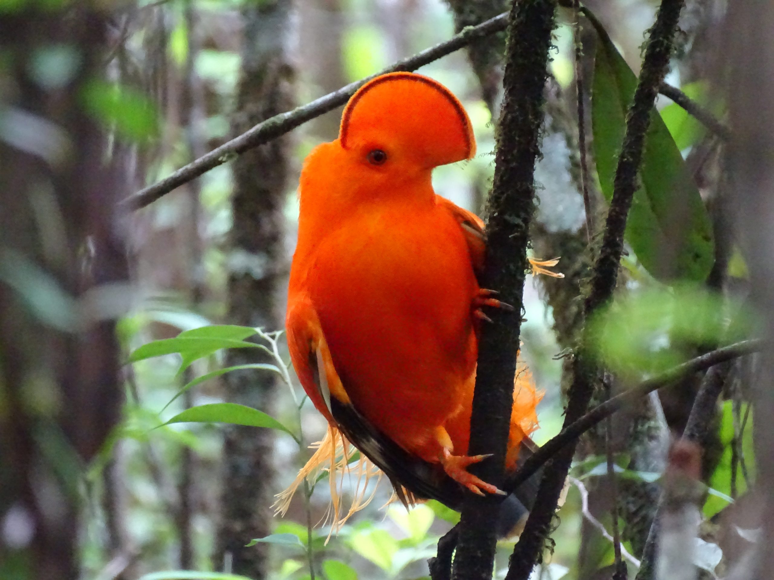 Auf dem Rückweg zum Flugzeug habe ich dann wieder wahnsinniges Glück, denn ich sehe drei von diesen wunderschönen auffälligen orangefarbenen Felsenhähnen. Eindrucksvolle Tiere mit einem knallig orangefarbenen Kamm auf dem Kopf. Sie sind nur ein paar Meter von mir entfernt im Gebüsch und flattern um ein Weibchen herum, das deutlich weniger auffällig aussieht und sich am Ende des Tages einen von den drei hübschen Bewerbern aussuchen muss.