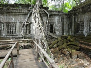 In den nächsten drei Tagen gibt es aber trotzdem noch viele andere Tempel zu erkunden, von denen zumindest der Ta Phrom und der Bantey Srei ebenso eindrucksvolle Kunstwerke sind. Der Besuch des Tempels Beng Mealea steht eigentlich nicht auf meinem Programm, aber mein Reisebegleiter Yim schwärmt in so hohen Tönen davon, dass wir uns einen halben Tag für den Ausflug in den Norden nehmen. Der Beng Mealea wird zwar von allen chinesischen Reisegruppen besucht, aber so gut wie nie von den Europäern. In China ist er bekannt, weil ein Film ihn groß in Szene gesetzt hat. Er liegt malerisch im Dschungel, so als hätte man ihn eben erst wieder entdeckt. Die Bäume und Wurzeln ranken sich um und durch die perfekt aufeinander passenden schweren Felsquader.