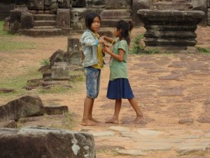 Wer sich für Tempel begeistert, der ist in Kambodscha genau richtig. Ich sehe Vishnu-Tempel, Shiva-Tempel, buddhistische Tempel, 1200 Jahre alte Tempel, 10 Jahre alte Tempel, Klostertempel, Tempel aus Sandstein und Tempel aus Lavasteinen…. Und ich bin begeistert. Ich kann viele wunderschöne Fotos machen, weil die Touristen im Juni Kambodscha meiden. Das ist einerseits ein großer Vorteil, wäre da nicht der Grund aus dem die Touristen das Land zu dieser Jahreszeit lieber nicht besuchen: das Klima. Bei 35 Grad im Schatten und annähernd 100% Luftfeuchtigkeit sind meine T-shirts und Hosen schon nach einer halben Stunde durchgeschwitzt. Glücklicherweise werden sommerliche Textilien hier überall für Spottpreise verkauft, so dass ich mir den Luxus gönne, spätestens jeden Abend eine frische Hose anzuziehen.