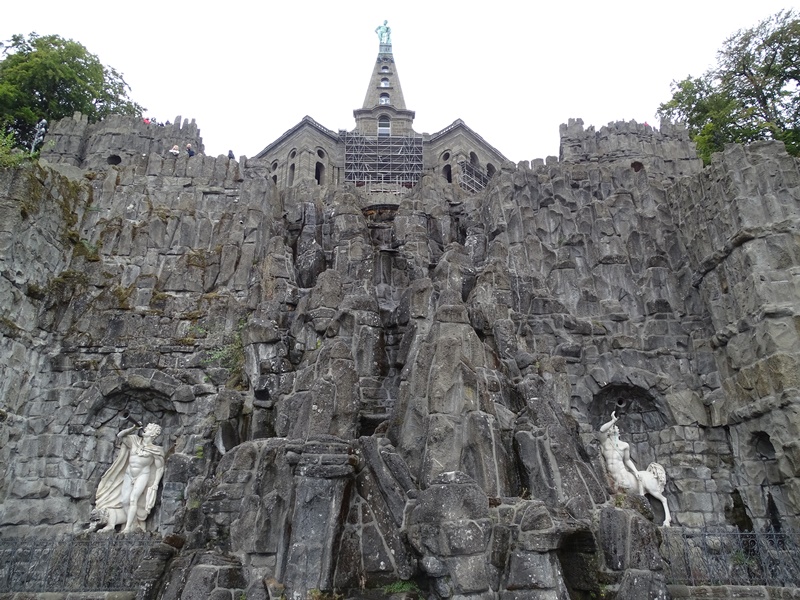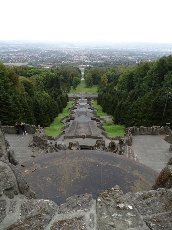 Der ganze Irrsinn geht zurück auf die Landgrafen, Fürsten und später Könige, die hier gelebt haben. Es entstand ein Bergpark mit vielen hundert Hektar gezähmter Natur. Zweimal in der Woche wird das Wasserspiel noch ausgelöst, bei dem aus einem Reservoir oben auf dem Hügel Wasser über die verschiedenen Etappen des Bergparks fließt: Von Becken zu Becken, über das Aquädukt, über die Kaskade in den künstlichen See, woraufhin der Wasserdruck eine Fontäne auslöst.