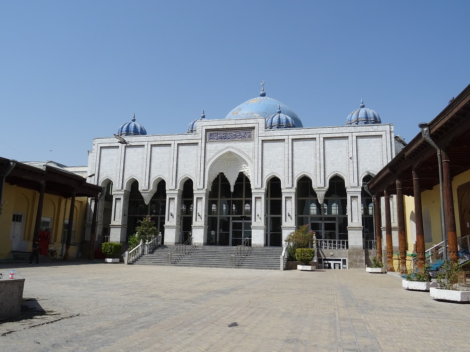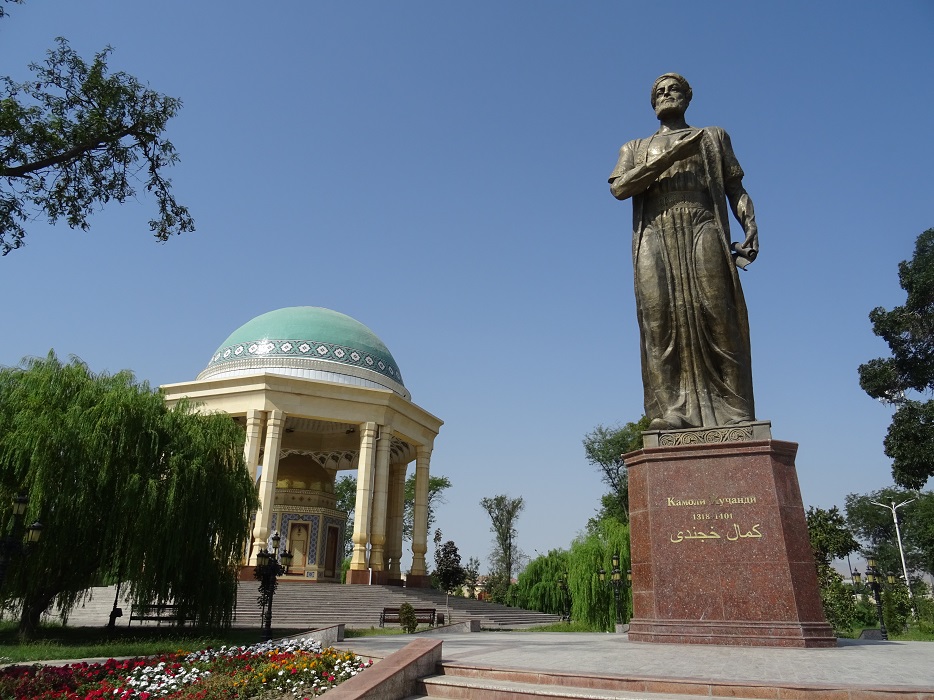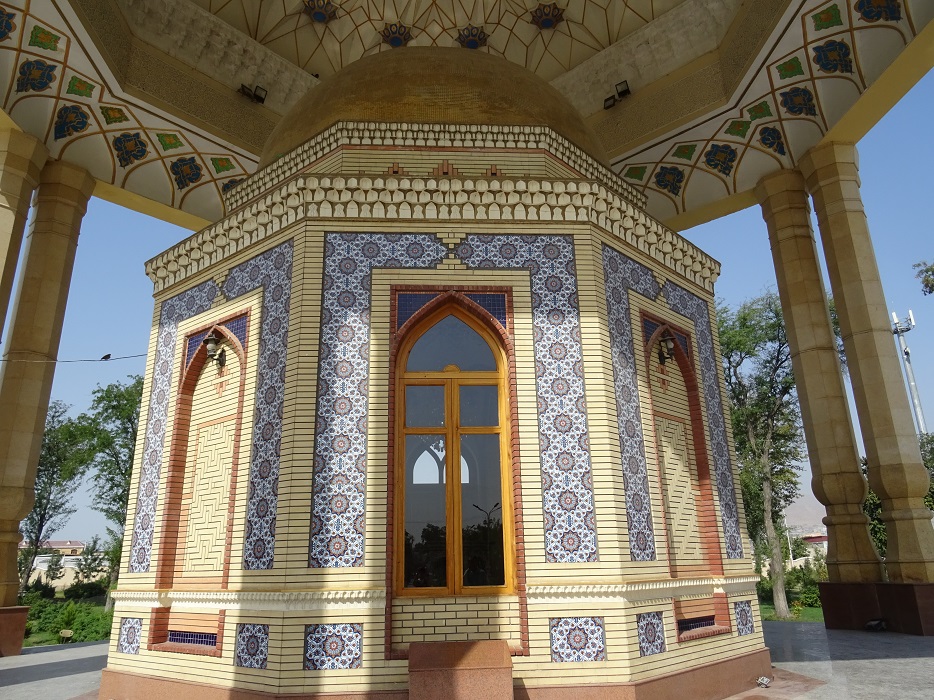 Dahinter steht ein brandneues Grabmal für einen Dichter aus dem 13. Jahrhundert. Das kann ich allerdings entschuldigen, denn der Dichter lag viele Jahrhunderte im Iran begraben, wo er gelebt hat und gestorben ist. Da er aber gebürtiger Tadschike war und es jetzt endlich ein Tadschikistan gibt, hat Präsident Rahmon vor ein paar Jahren darum gebeten, die Asche des berühmten Dichters Khujandi zurückzubekommen. Sie liegt nun in einer kleinen Box in einem wirklich hübschen Grabmal mit einer grünlichen Kuppel.