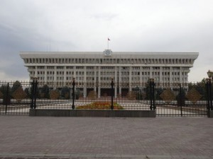 dt von Kirgistan: Bishkek, das ehemalige Frunze. Im Zentrum stehen einige sehr sozialistisch anmutende Denkmäler und Regierungsgebäude. Vor dem Leninmuseum, für das ich leider keine Zeit habe, gibt es eine eindrucksvolle Wachablösung. Die Soldaten können ihre Beine beim Stechschritt so hoch heben, dass sie damit einen gleichgroßen Gegner an der Nase treffen könnten. Außer mir scheint jedoch keiner der Zuschauer diese Vorführung lustig zu finden, weshalb ich nur still lächele.