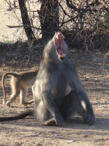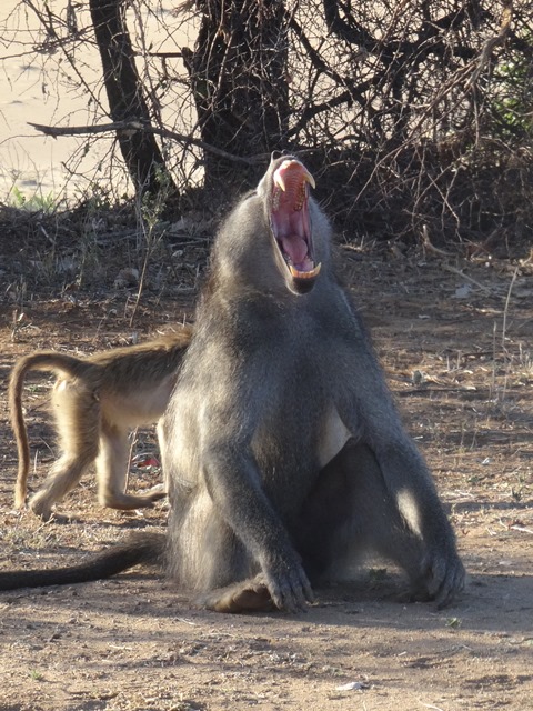 Ich sehe auf meinen Pirschfahrten durch den Park große Elefantenherden, Büffel, Zebras, verschiedene Antilopen, Gnus, Schreiseeadler, Nilpferde, Nashörner, Marabus, Paviane, Hornraben und putzige Grünmeerkatzen. Letztere sind die wohl am wenigstens im wilden Zustand verbliebenen Parkbewohner, denn ähnlich wie einige Nialas und Impalas leben viele von ihnen auf dem Gelände der Lodges und versuchen mit allen Tricks, den menschlichen Besuchern ihre Nahrungsmittel abzuluchsen. Dabei ist den Grünmeerkatzen jedes Mittel recht. Sie greifen auch gerne auf schlichten Diebstahl zurück und sind damit sehr erfolgreich.
