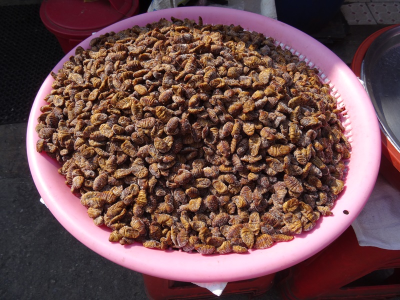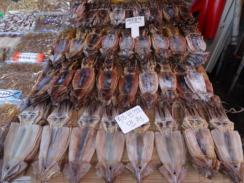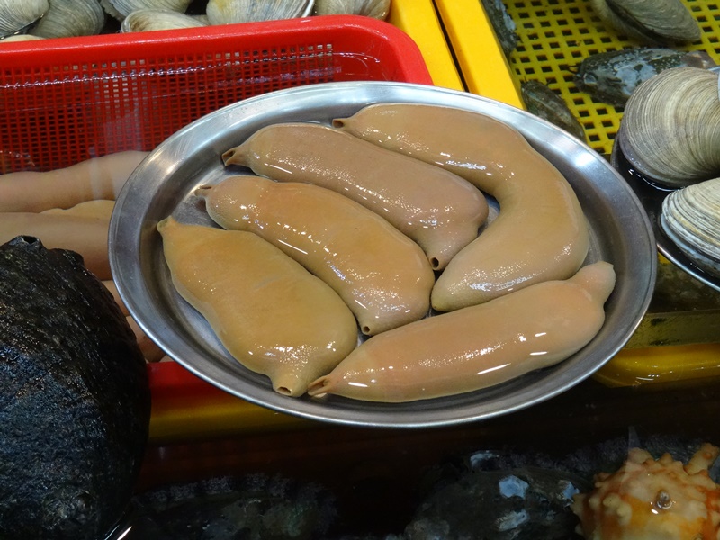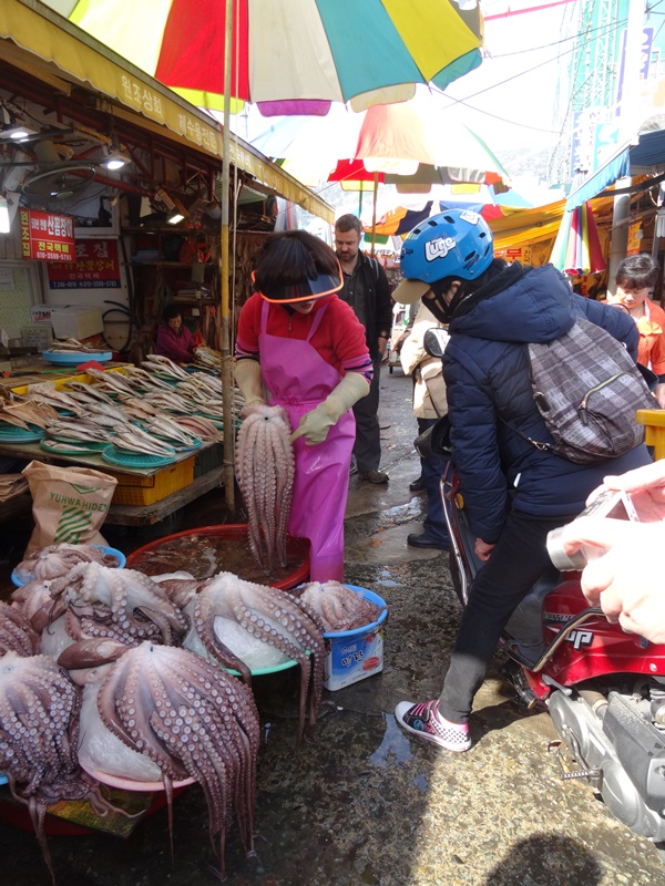 Auf den Märkten wurden getrocknete Muscheln und Tintenfischteile wie Chips oder Nüsse als Snack verkauft. Besonders interessant waren die Fischmärkte, wo es mir fast das Herz brach, die wunderschönen Oktopusse, die ja so intelligente Tiere sind und sogar Fußballergebnisse voraussagen können, in Schüsseln auf einen Käufer warten zu sehen. Etwas weniger intelligent und fast noch weniger Schmackhaft wirkten die verschiedenen Arten von Seegurken und Schnecken auf mich. Abalone scheint sehr beliebt zu sein und es gab auch so eine sackartige gurken- beziehungsweise penisförmige Lebensform, die vor sich hin pulsierte und sehr unappetitlich aussah. Unappetitliches Aussehen schützt aber in Korea niemanden davor, gegessen zu werden!!