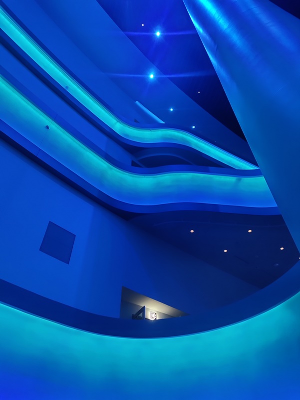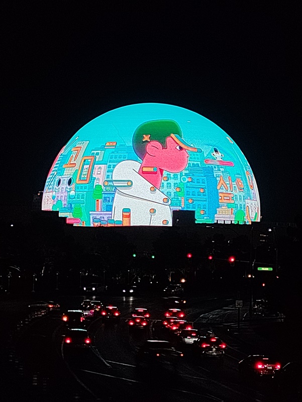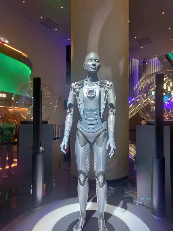 Auf jeden Fall war ich begeistert von dem Film mit grandiosen Naturaufnahmen aus aller Welt, der auf einer gigantischen Leinwand gezeigt wird. High Tech. 8K. Wow. Und die Stühle wackeln, wie in einem alten 3D Kino. Okay das hätte man sich sparen können. Aber die Bilder waren wirklich klasse. Sie haben mein Fernweh geweckt. In der Eingangshalle der Sphere gibt es vor der eigentlich Show noch ein paar lustige Spielereien für die Besucher, unter anderem zwei KI-Roboter, die Fragen beantworten, also ChatGPT auf Beinen. Zudem ein paar schöne Hologramme und Animationen. Eindrucksvoll war die Demonstration einer Lautsprecherinstallation, bei der eine Ansprache gleichzeitig in vier Sprachen ausgestrahlt wird und je nachdem, wo man vor den vier Lautsprechern steht, hört man nur eine der vier Sprachen. Sehr cool.