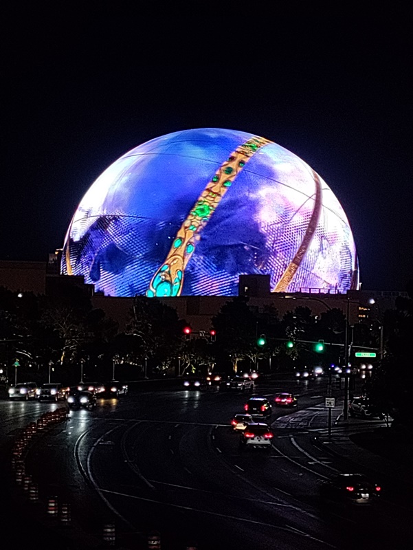 Seit ein paar Jahren bereits steht in Las Vegas nur einen Block vom Strip entfernt diese wunderschöne Kugel namens the Sphere, die in der Nacht in den schillerndsten Farben leuchtet. Bei meinen beiden vorherigen Besuchen habe ich schon Stunden damit verbracht, vor der Kugel zu stehen und mir die bunten bewegten Bilder anzusehen oder diese zu fotografieren. Wunderschön. Dieses Jahr habe ich es mir ein Ticket gegönnt, um the Sphere von innen zu erleben. Das ist kein günstiges Vergnügen, aber es war seinen Preis beinahe wert.