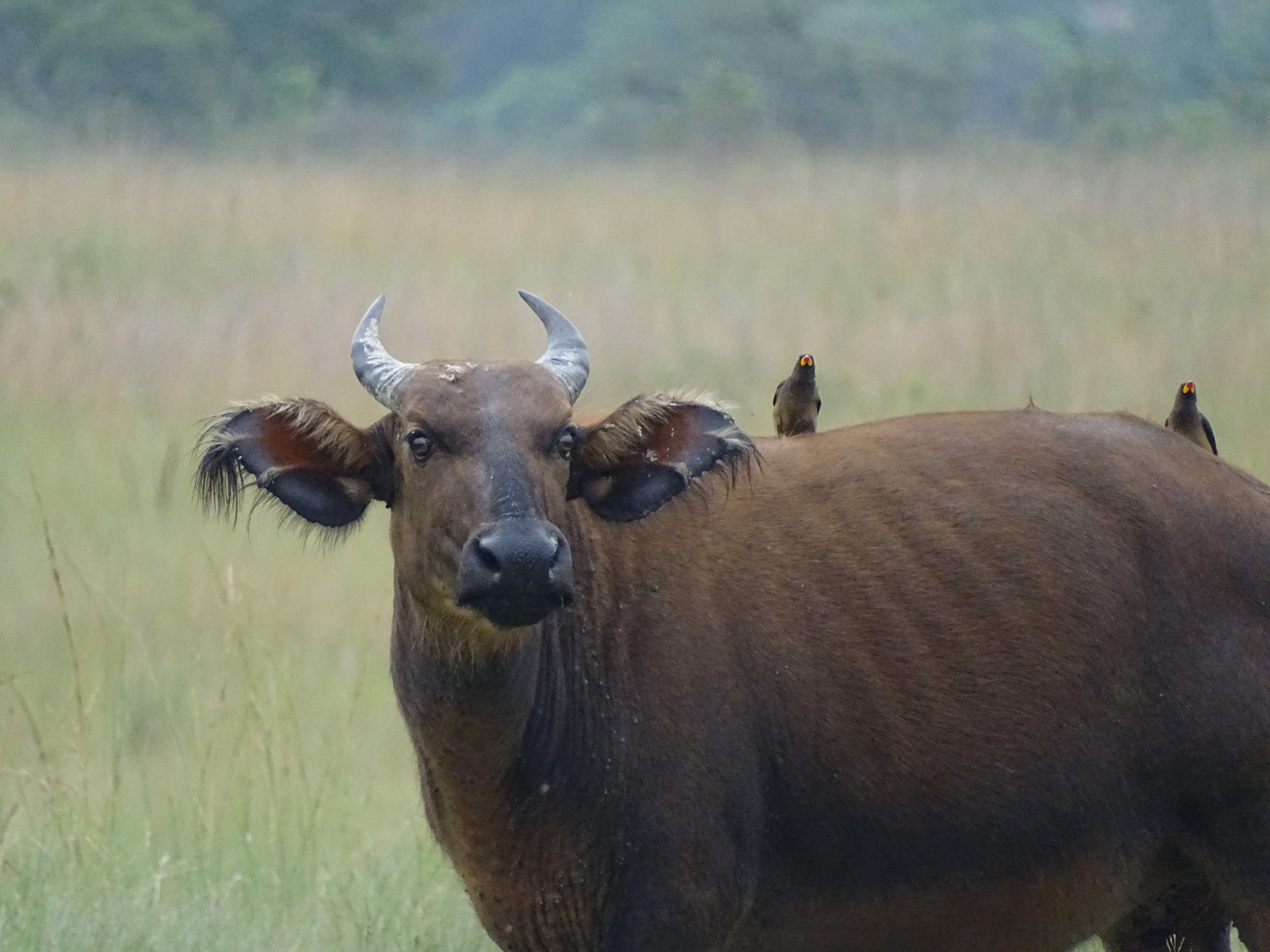 Auf der offenen Savanne ist es viel leichter, Tiere zu sehen. Die Waldbüffel lieben das frische Gras der Savanne und verbringen viel Zeit außerhalb des Waldes, wenn es dort etwas Schmackhaftes zu essen gibt. Nach dem nächtlichen Regen ist das Gras sicher echt lecker.