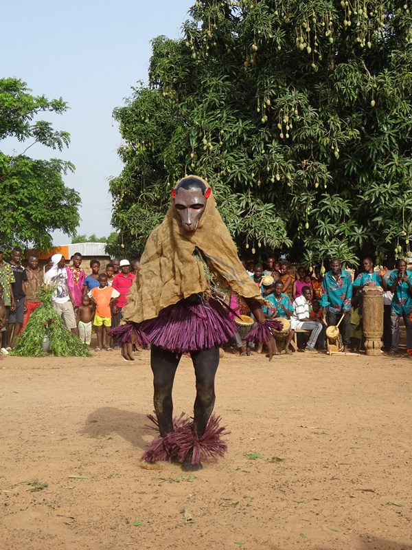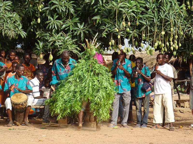 Der erste Tanz wird von einem jungen Mann aufgeführt, der in einer Art Kostüm aus Zweigen und Blättern steckt. Er tanzt zu Trommelmusik und dissonantem Flöten, das mich ein wenig an die Musik in Burkina Faso erinnert.