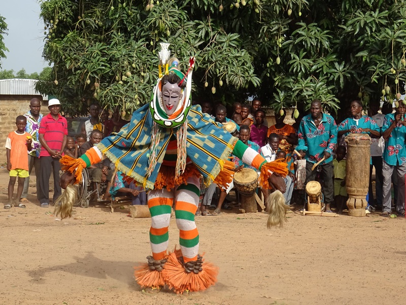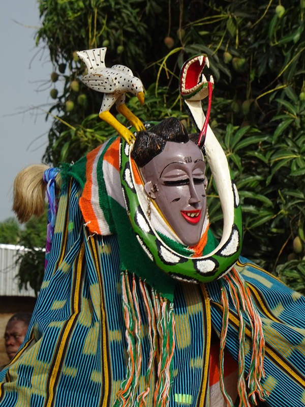 Beim dritten Tanz erscheint ein muskulöser junger Mann mit einer eindrucksvollen hölzernen Maske. Auf ihr sind eine Schlange und ein Falke zu sehen, die auf einem lächelnden Gesicht sitzen. Ansonsten ist der Mann in Kleidung gehüllt, die die Farben der Flagge der Elfenbeinküste hat. Der Tanz gehört zu den Initiationsriten der Baoulé und wird zu verschiedenen Gelegenheiten aufgeführt, nicht nur für Touristen. Der Tanz sieht anstrengend aus und es ist jede Menge Beinarbeit gefordert.
