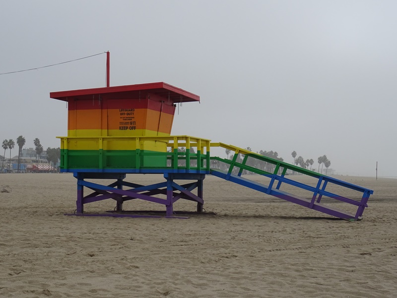 Ich habe Glück, denn auch im November sind am Muscle-Beach noch einige hulkförmige Herrschaften zu Gange. Zwischen bunt angemalten Palmen posieren viel zu dicke Damen in knappen Bikinis für anzügliche Fotos. Der Strand ist mit Möwen übersät und ich sehe sogar einige Pelikane. Einer der charakteristischen Bademeister-Häuschen, die dank David Hasselhoff und Pamela Anderson jeder Europäer kennt, ist in Regenbogenfarben angestrichen. Mit kommt sofort das Wortspiel Baywatch / Gaywatch in den Sinn und ich muss schmunzeln, wofür ich von den Möwen nur mit Missachtung gestraft werde.