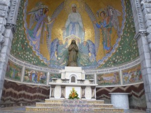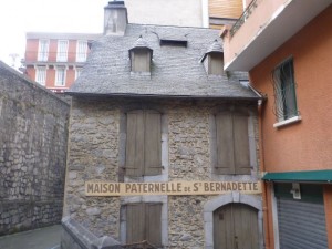 Dann machen wir uns auf den Weg, der einmal rund durch die Stadt zu allen Sehenswürdigkeiten führt. Der Weg ist durch eine hellblaue Linie auf dem Boden gekennzeichnet, die nur zweimal unterbrochen ist, wo Straßenarbeiten im Gange sind. Die blaue Linie führt uns zum Geburtshaus der Bernadette Soubirous, das liebevoll restauriert und wie uns alte Fotos zeigen vor dem drohenden Einsturz gerettet wurde. Eine ältere Nonne mit einem Sprachfehler erzählt uns die Geschichte der Bernadette. Im zarten Alter von 14 Jahren ist dem armen Kind an einem sehr kalten Morgen im Februar eine Frau in Weiß erschienen. Wie es sich später herausstellte, handelte es sich bei der Frau um Maria, die Mutter Gottes. Zunächst glaube ihr natürlich niemand, als die Erscheinung dann aber behauptete, sie sei die unbefleckte Empfängnis, was Papst Pius erst wenige Jahre zuvor als Neuerung in der Rubrik „an diese haarsträubenden Dinge müsst ihr glauben, damit ihr in den Himmel kommt“ vorgestellt hatte, begannen die Leute, ihr zu glauben.
