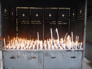 Rechts neben der Grotte ist eine Reihe von metallenen Verschlägen aufgestellt, die ein wenig an Weihnachtsmarktbuden erinnern. In ihnen brennen die Kerzen vor sich hin, die die Gläubigen hier ab 2,50 Euro erstehen können. Für diejenigen, deren Gebete oder Wünsche etwas kniffliger sind als es die Standard Kerze bewältigen kann, gibt es Kerzen in allen Größen bis hin zu mannshohen Ungetümen für mehrere Hundert Euro, die dann XXX Stunden lang brennen und größere Wunder vollbringen können, als die kleinen.