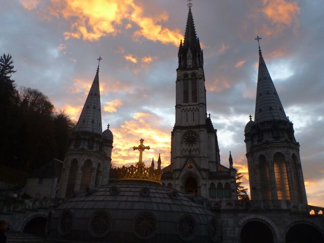 In einem der Souvenirshops suchen wir Wärme und Ablenkung, bevor wir bei Sonnenuntergang noch einmal die eindrucksvolle Kathedrale besuchen und fotografieren wollen. Es gibt hier Bernadette-Bonbons, Kerzen in allen Formen und Farben, Kanister um das heilige Wasser abzufüllen, Rosenkränze, Pins, Armbänder, Bücher, Postkarten, Gebet- und Psalmensammlungen in allen Sprachen und natürlich Stauen der Mutter Gottes von Überraschungseigröße bis zu Lebensgröße.